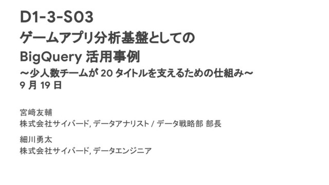 D1-3-S03 ゲームアプリ分析基盤としての BigQuery 活用事例 ~少人数チームが 20 タイトルを支えるための仕組み~ 9 月 19