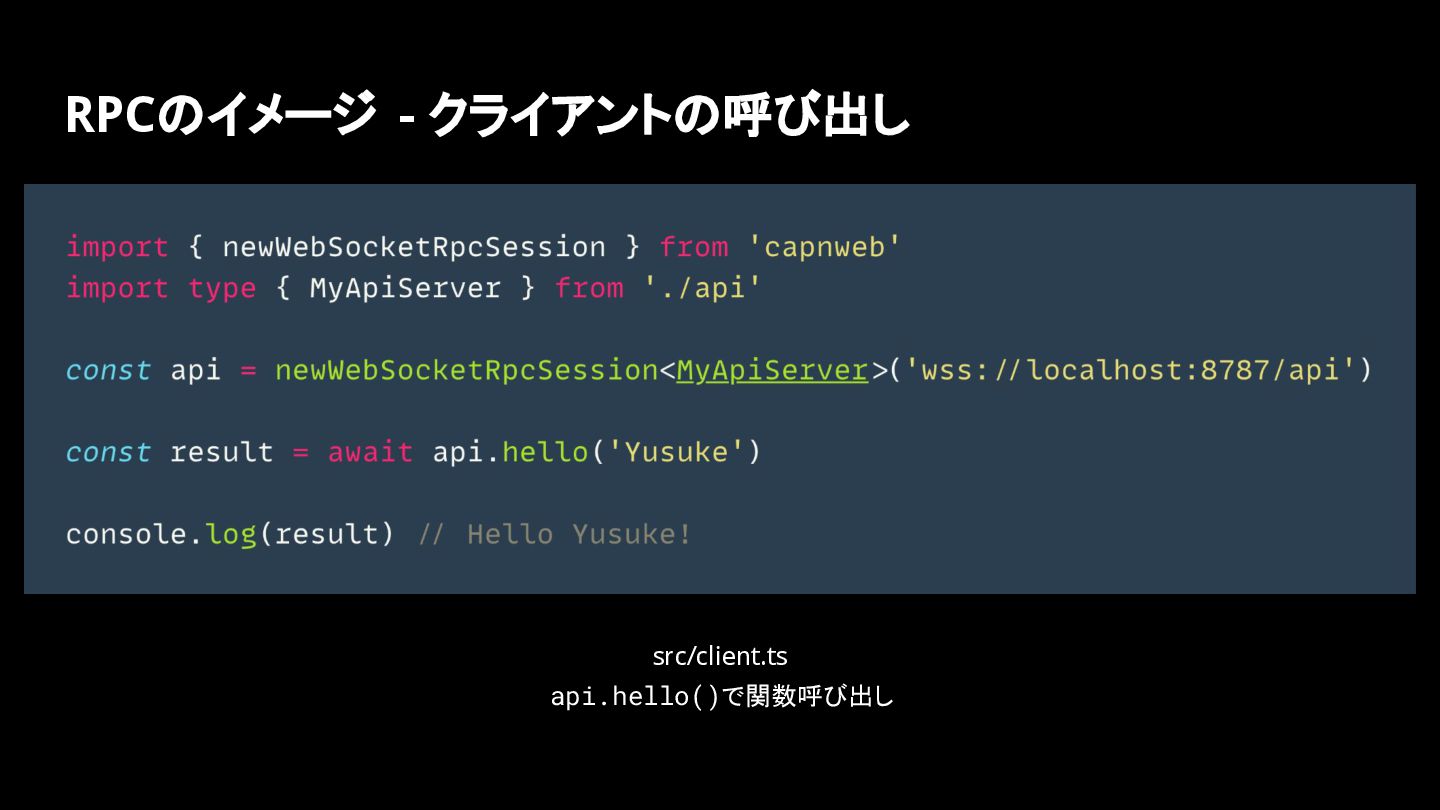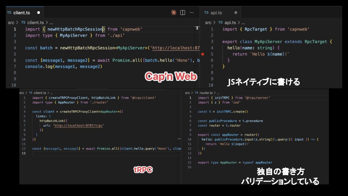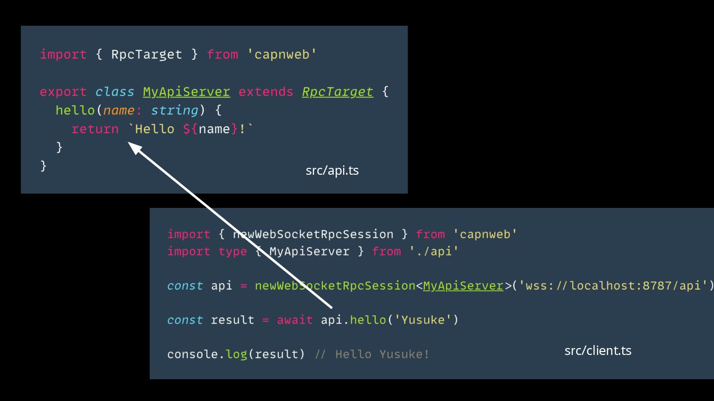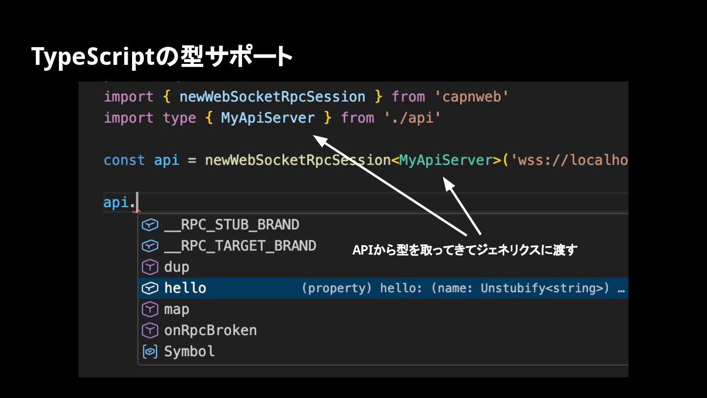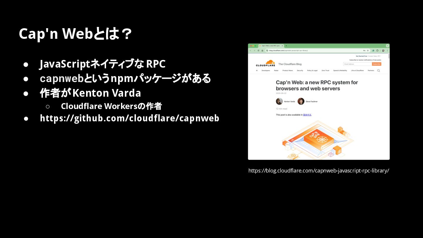 ◦ Cloudflare Workersの作者 • https://github.com/cloudflare/capnweb https://blog.cloudflare.com/capnweb-javascript-rpc-library/