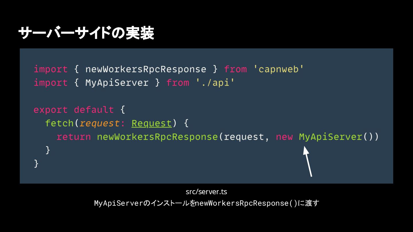 サーバーサイドの実装 src/server.ts MyApiServerのインストールをnewWorkersRpcResponse()に渡す