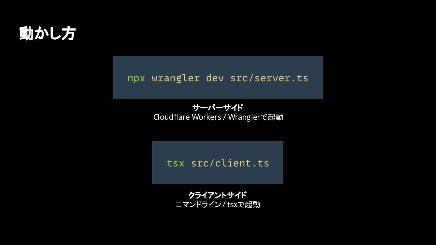 動かし方 サーバーサイド Cloudflare Workers / Wranglerで起動 クライアントサイド コマンドライン / tsxで起動