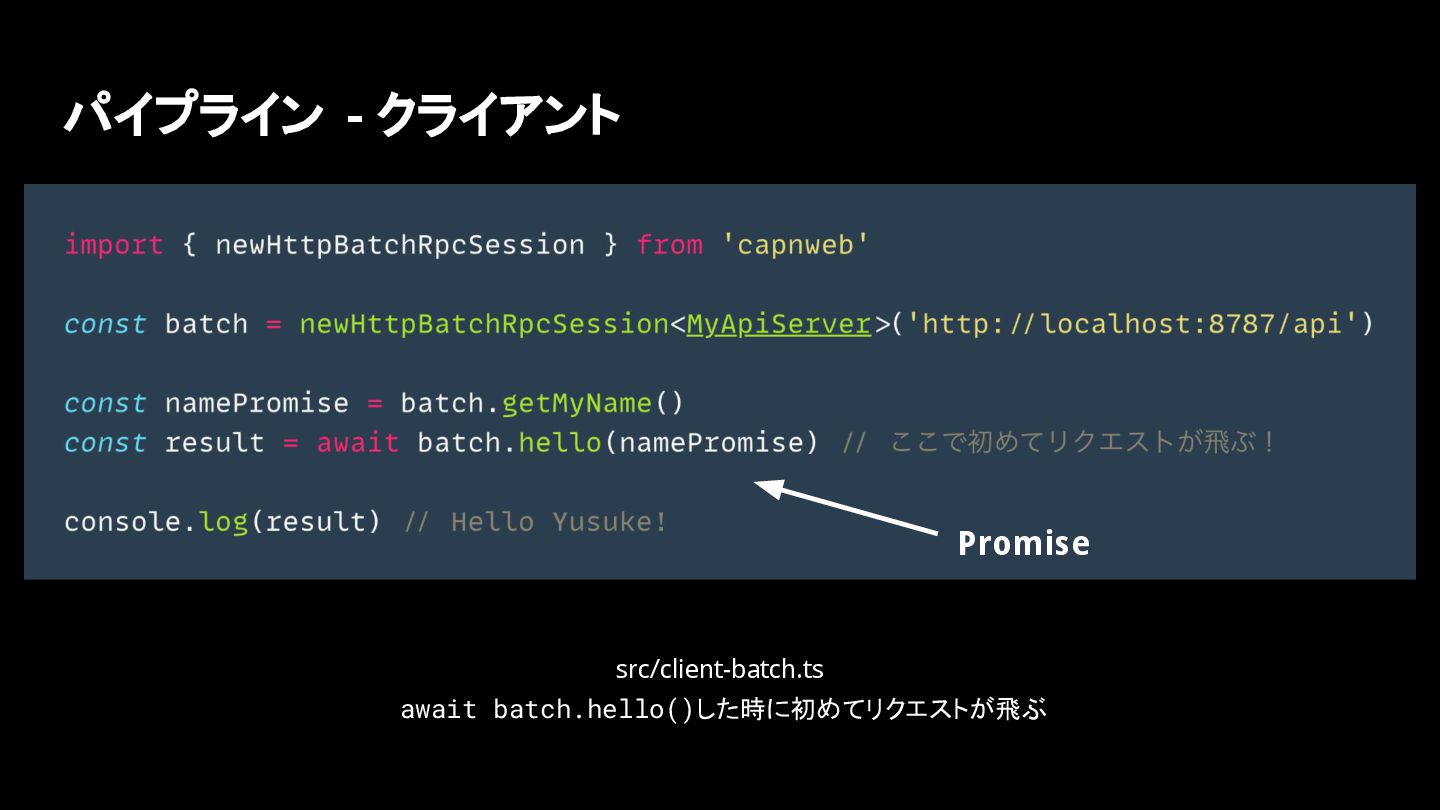 パイプライン • APIを変えずに Promiseをメソッドに渡せる • batch.hello()の時にawaitして初めてリクエストが飛ぶ • Cap’n WebのPromiseは「通常の Promise」ではない!