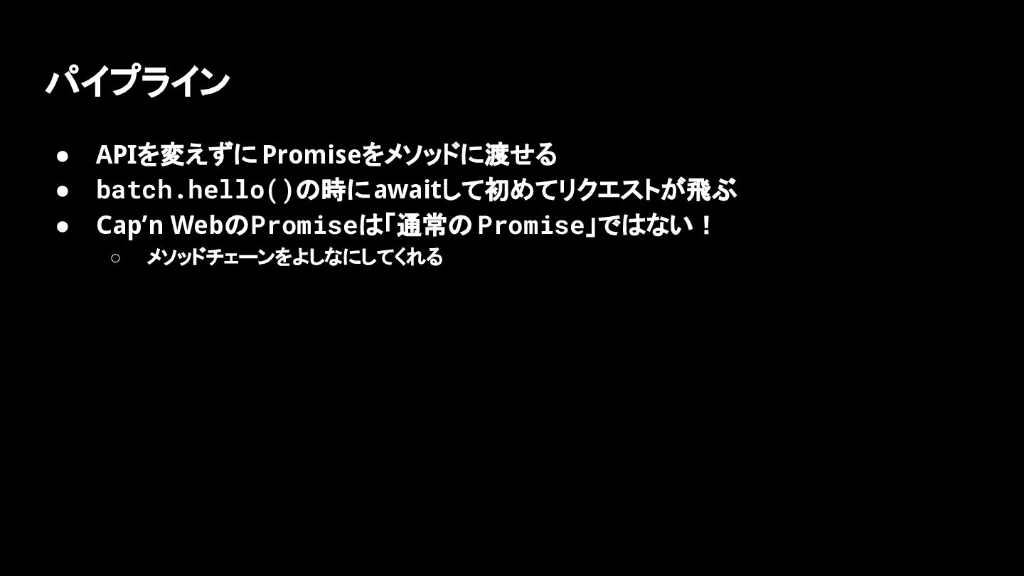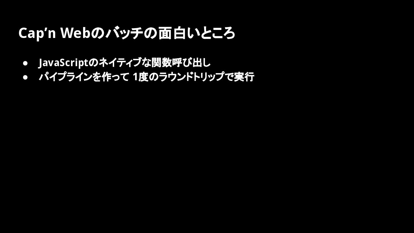 Cap’n Webのバッチの面白いところ • JavaScriptのネイティブな関数呼び出し • パイプラインを作って 1度のラウンドトリップで実行