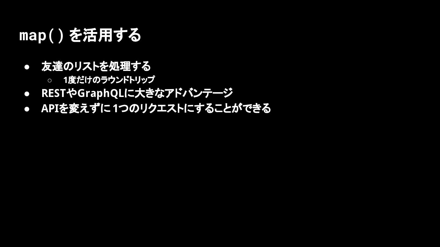 map() を活用する • 友達のリストを処理する ◦ 1度だけのラウンドトリップ • RESTやGraphQLに大きなアドバンテージ • APIを変えずに