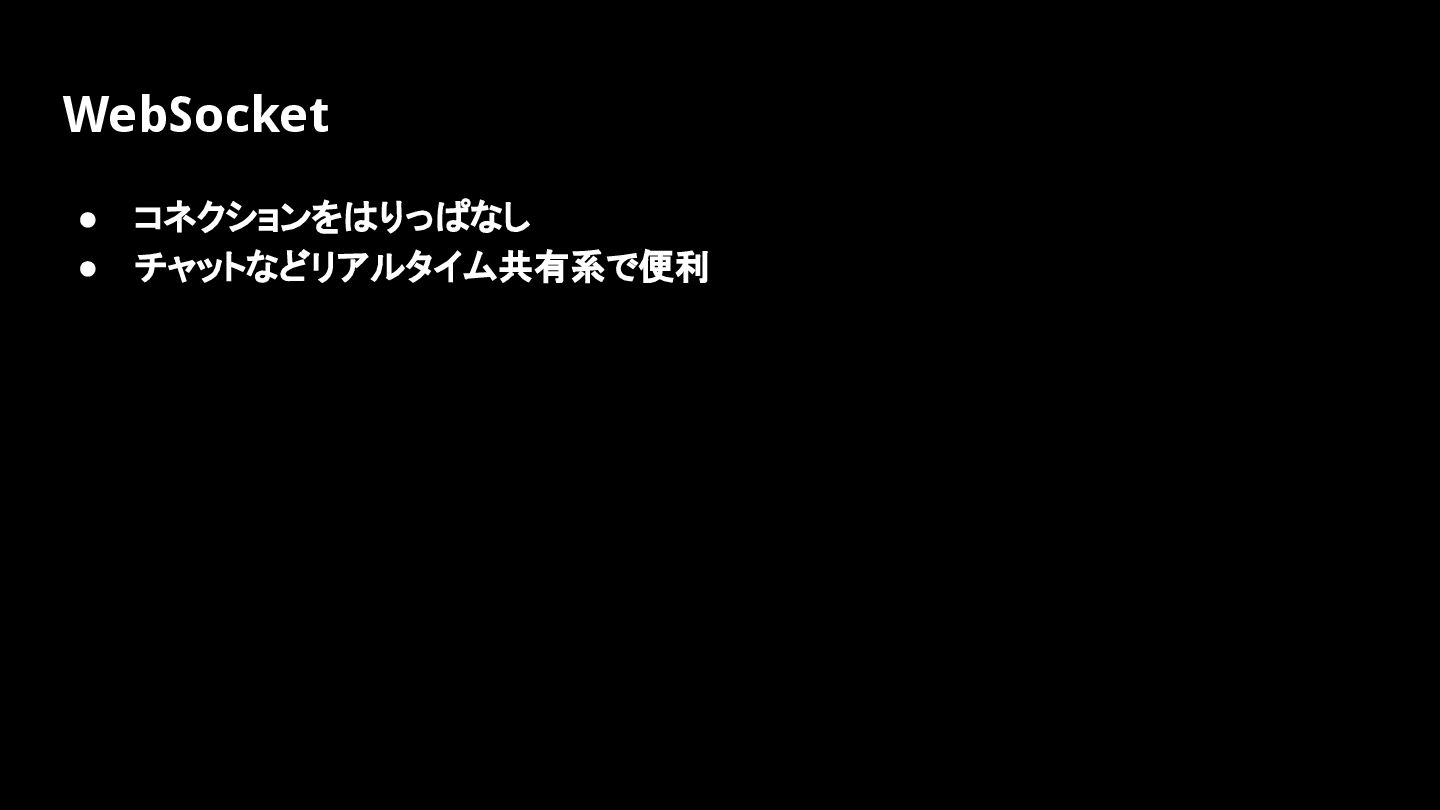 WebSocket • コネクションをはりっぱなし • チャットなどリアルタイム共有系で便利