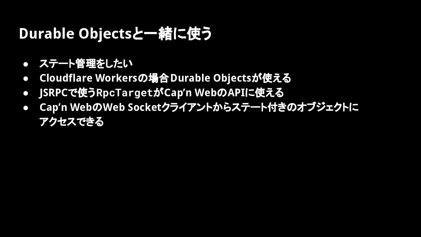Durable Objectsと一緒に使う • ステート管理をしたい • Cloudflare Workersの場合Durable Objectsが使える • JSRPCで使うRpcTargetがCap’n