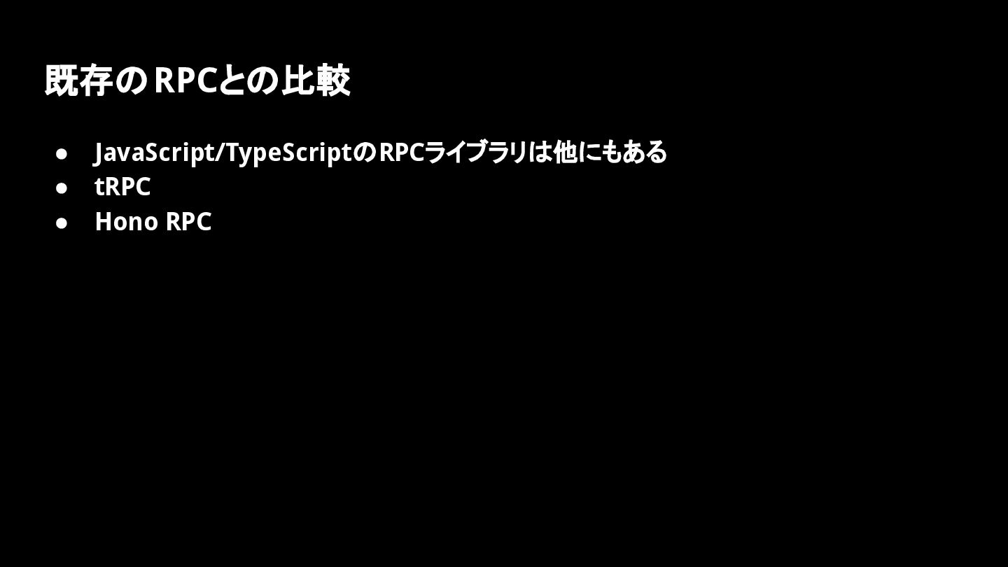 既存のRPCとの比較 • JavaScript/TypeScriptのRPCライブラリは他にもある • tRPC • Hono RPC
