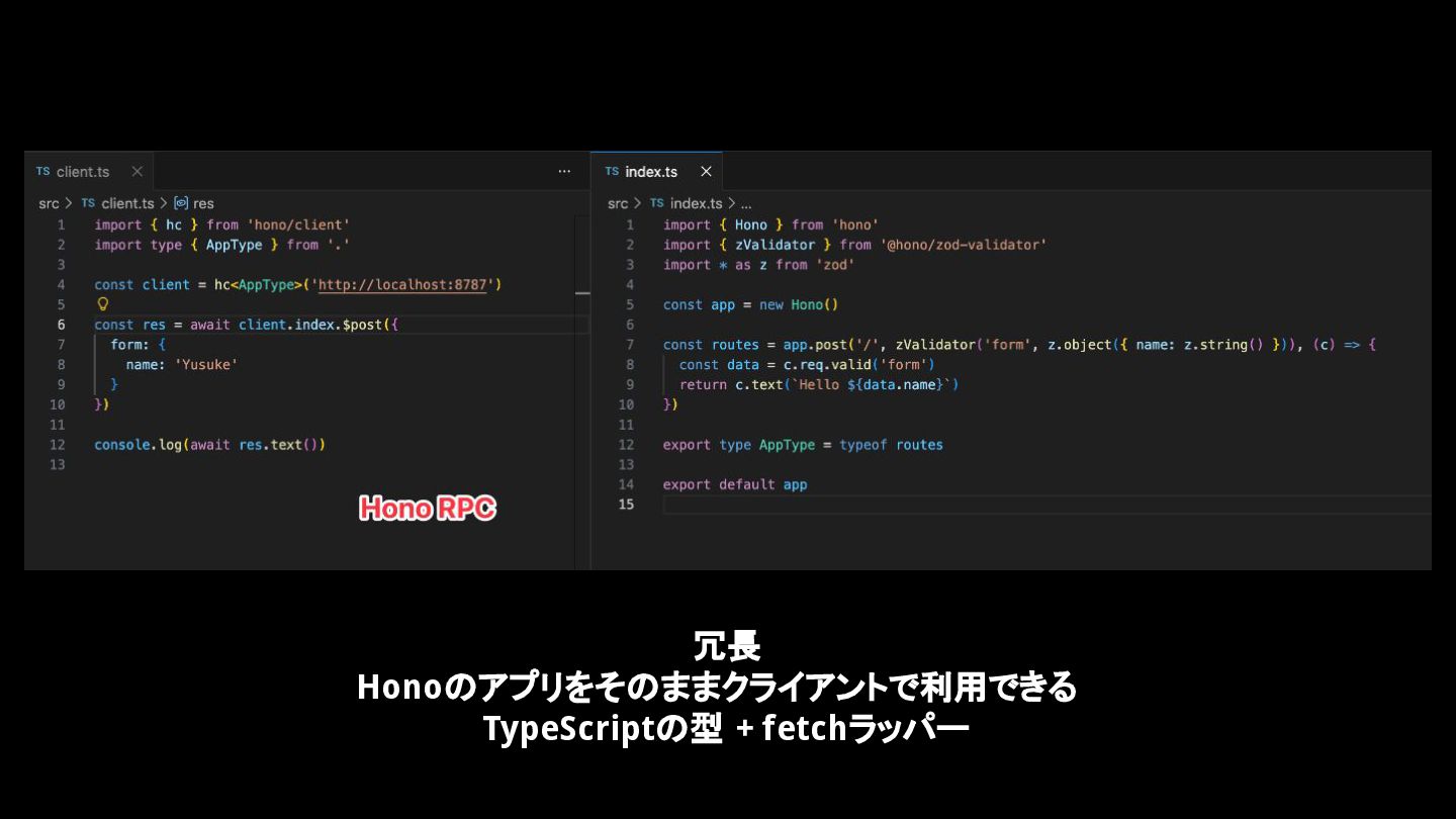 冗長 Honoのアプリをそのままクライアントで利用できる TypeScriptの型 + fetchラッパー
