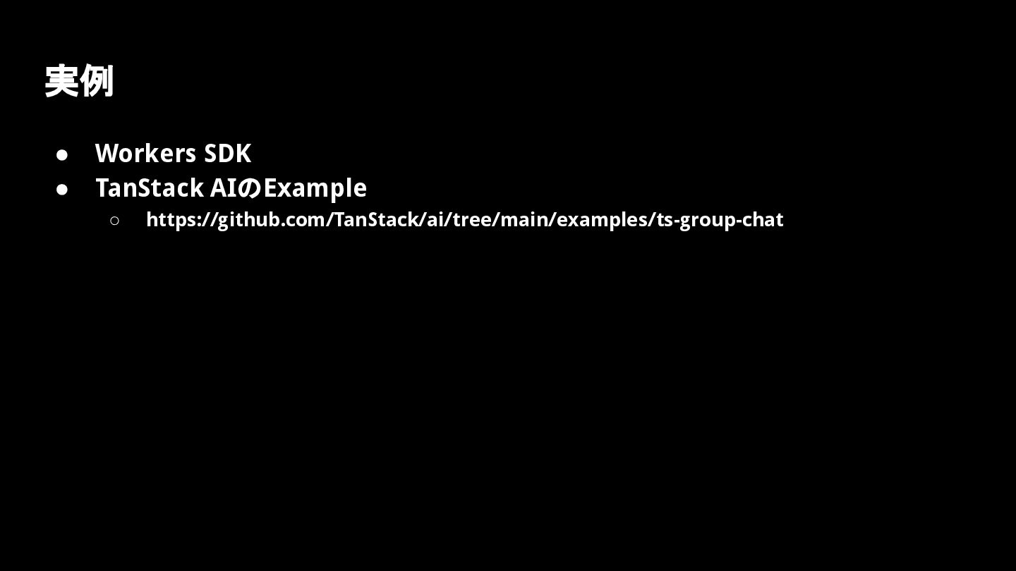 実例 • Workers SDK • TanStack AIのExample ◦ https://github.com/TanStack/ai/tree/main/examples/ts-group-chat