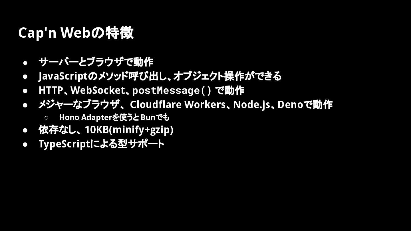 Cap'n Webの特徴 • サーバーとブラウザで動作 • JavaScriptのメソッド呼び出し、オブジェクト操作ができる • HTTP、WebSocket、postMessage() で動作 •