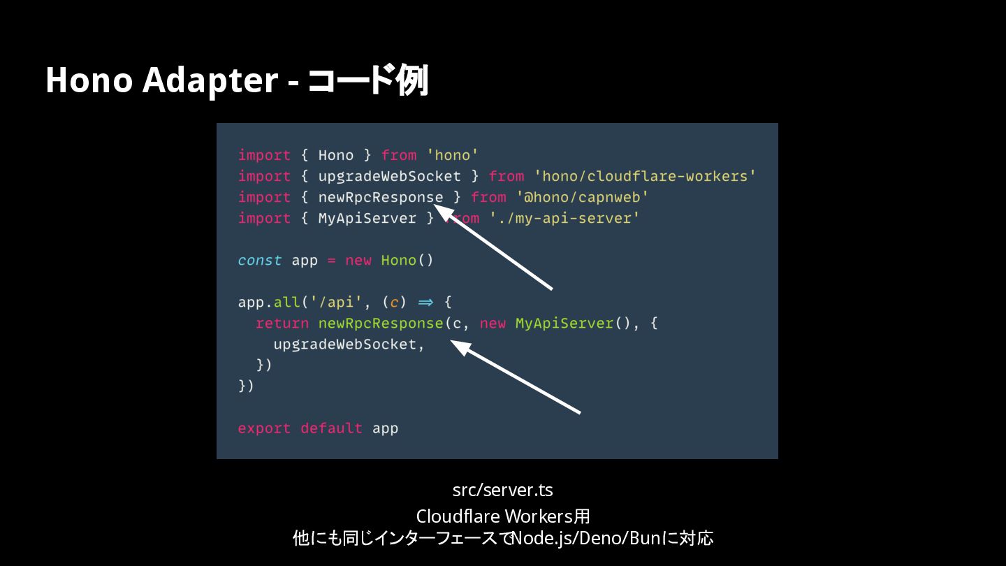 Hono Adapter - コード例 src/server.ts Cloudflare Workers用 他にも同じインターフェースで Node.js/Deno/Bunに対応