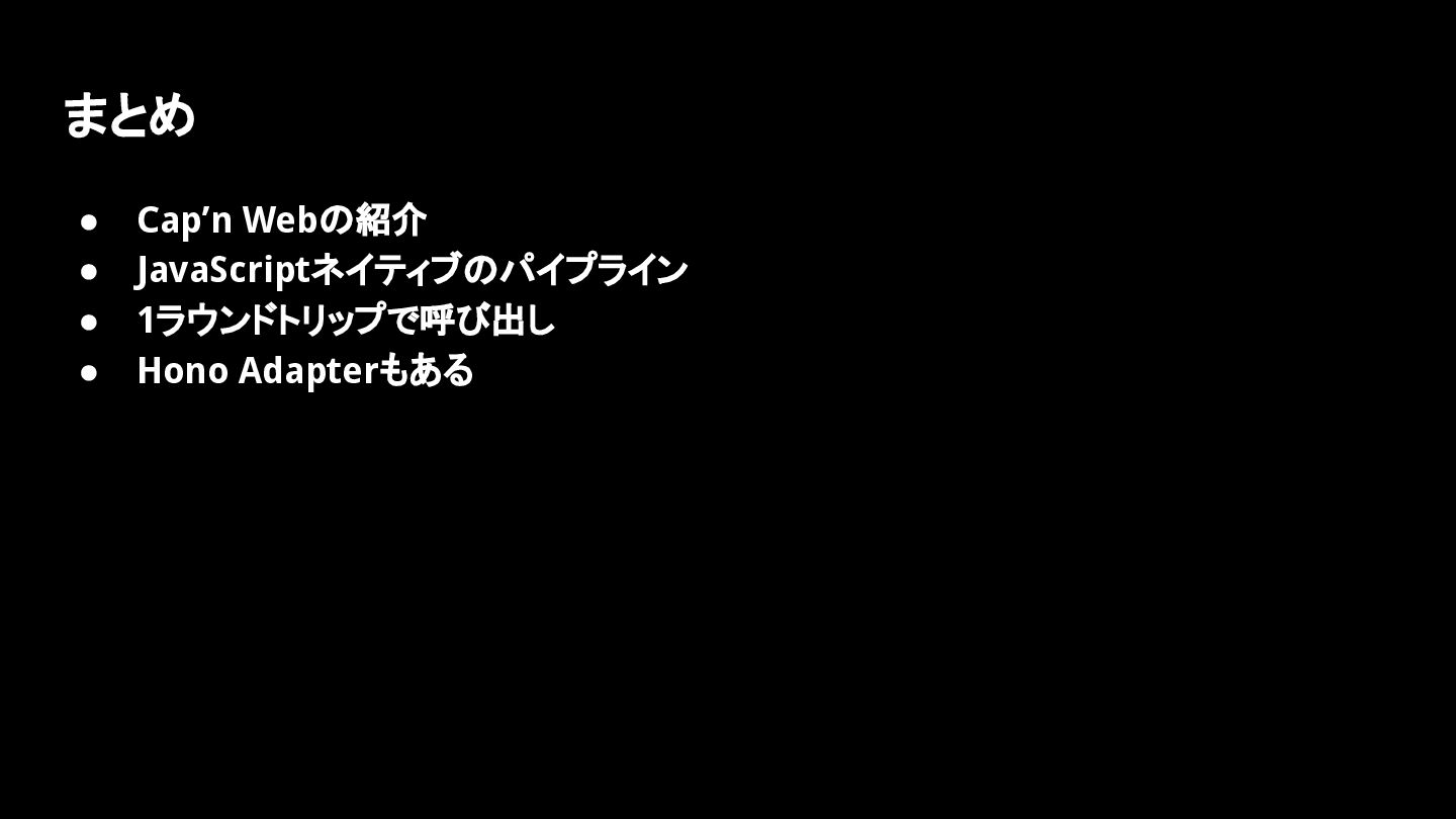 まとめ • Cap’n Webの紹介 • JavaScriptネイティブのパイプライン • 1ラウンドトリップで呼び出し • Hono