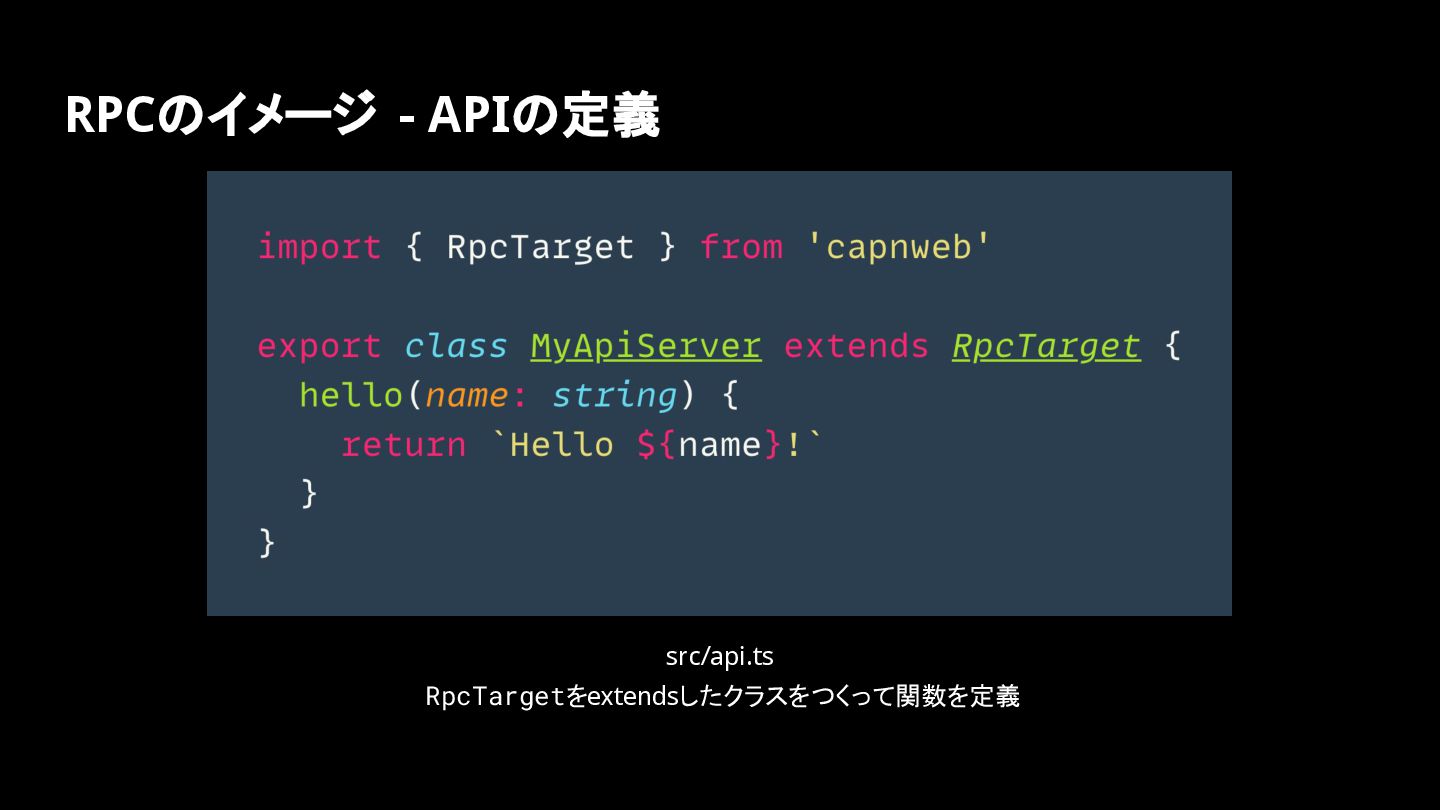 RPCのイメージ - APIの定義 src/api.ts RpcTargetをextendsしたクラスをつくって関数を定義