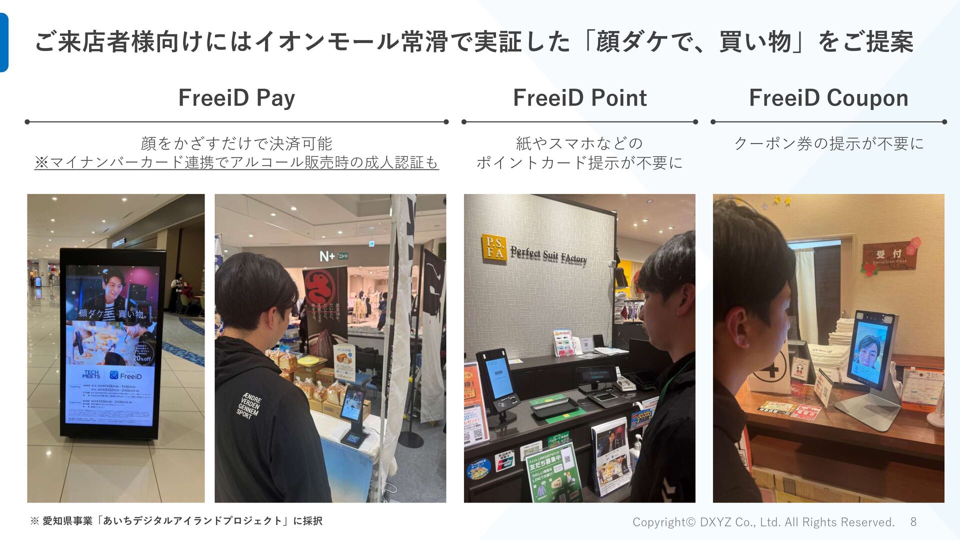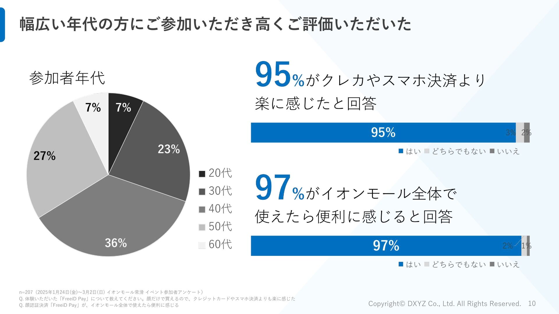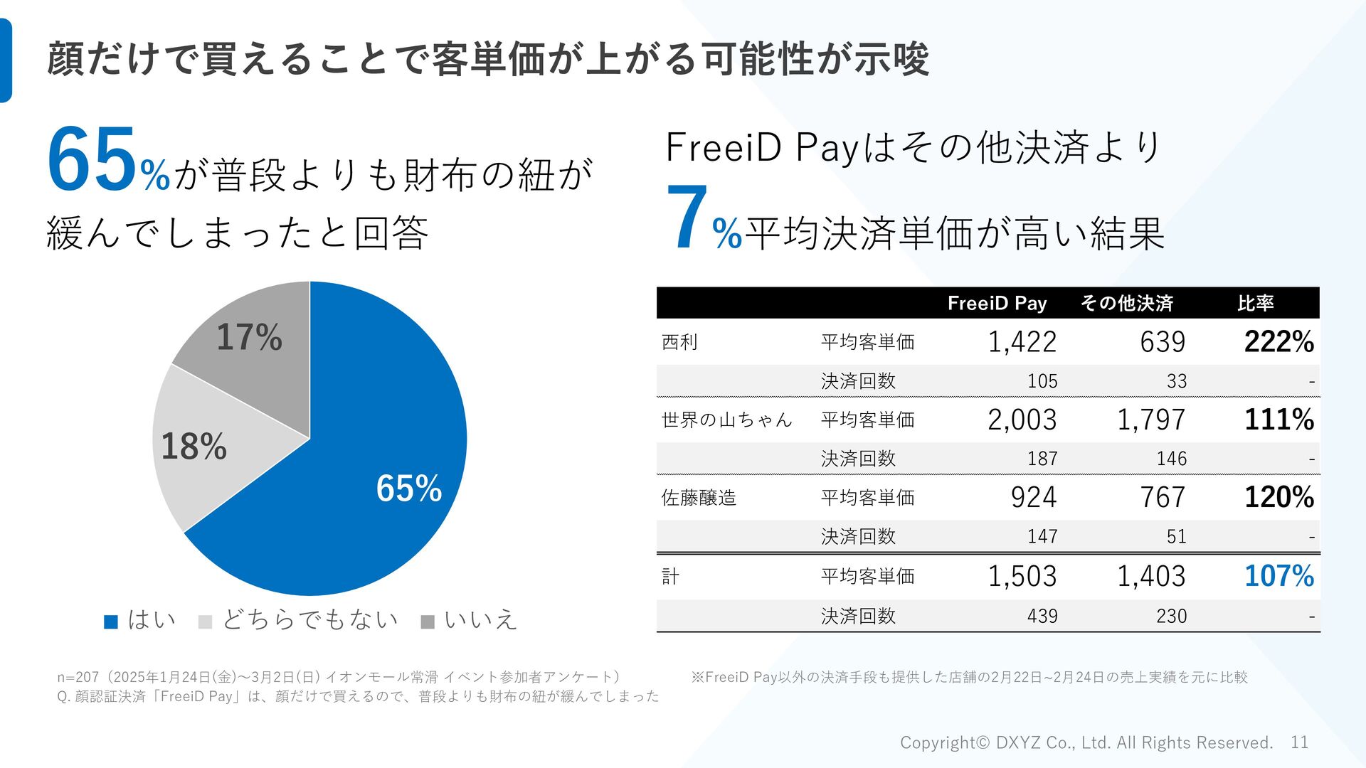 イオンモール常滑 イベント参加者アンケート) Q. 顔認証決済「FreeiD Pay」は、顔だけで買えるので、普段よりも財布の紐が緩んでしまった 65% 18% 17% はい どちらでもない いいえ 65%が普段よりも財布の紐が 緩んでしまったと回答 FreeiD Payはその他決済より 7%平均決済単価が高い結果 ※FreeiD Pay以外の決済手段も提供した店舗の2月22日~2月24日の売上実績を元に比較 FreeiD Pay その他決済 比率 西利 平均客単価 1,422 639 222% 決済回数 105 33 - 世界の山ちゃん 平均客単価 2,003 1,797 111% 決済回数 187 146 - 佐藤醸造 平均客単価 924 767 120% 決済回数 147 51 - 計 平均客単価 1,503 1,403 107% 決済回数 439 230 -