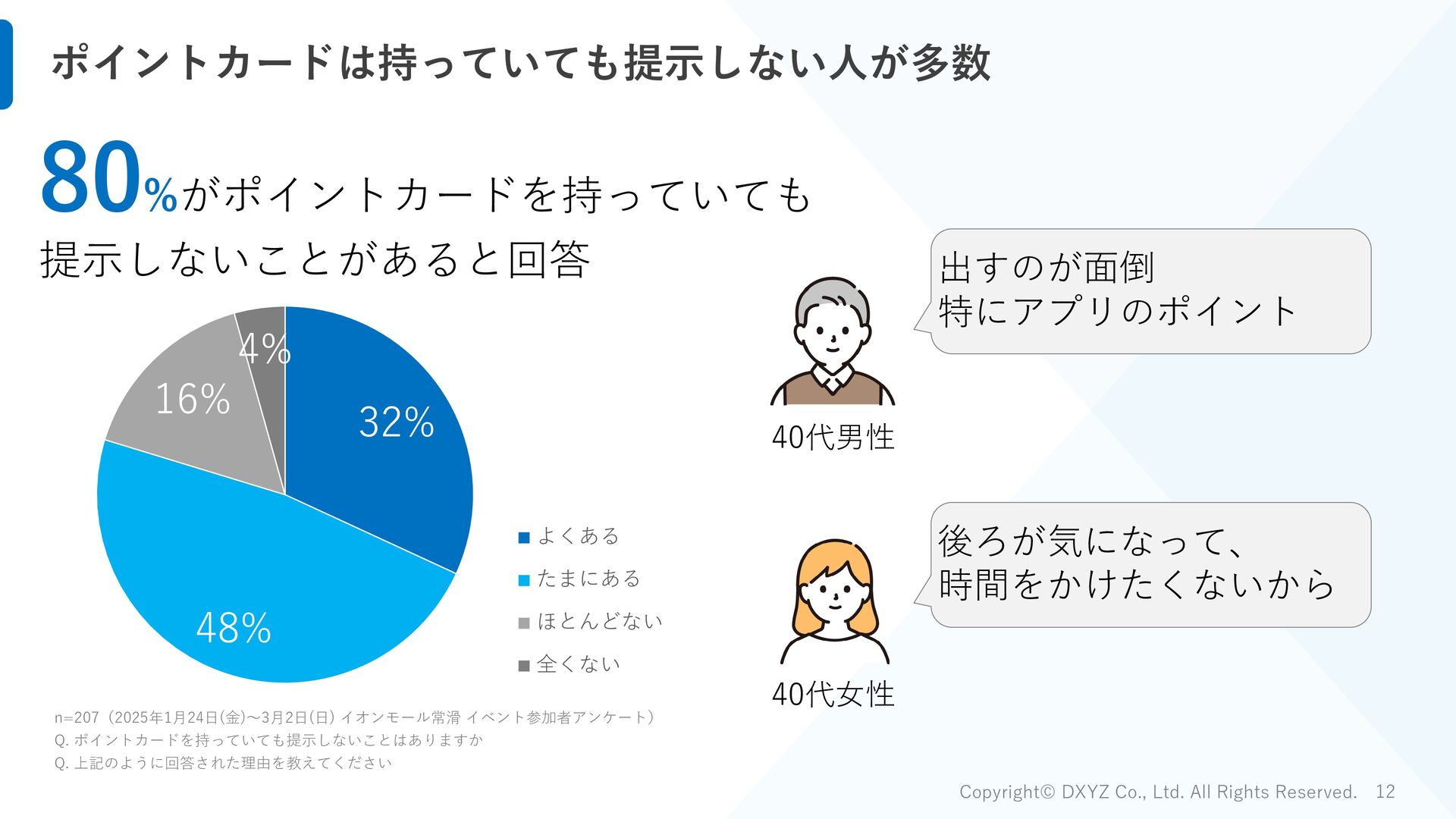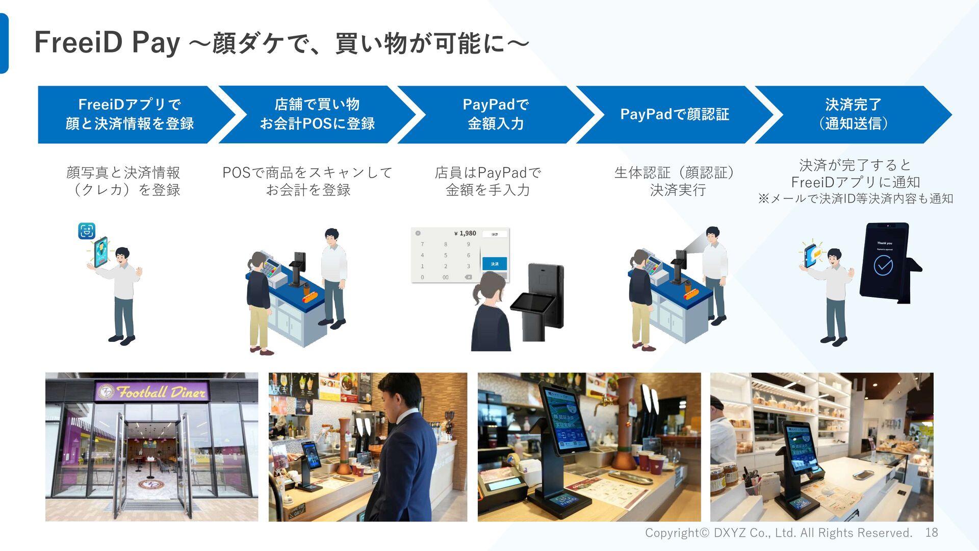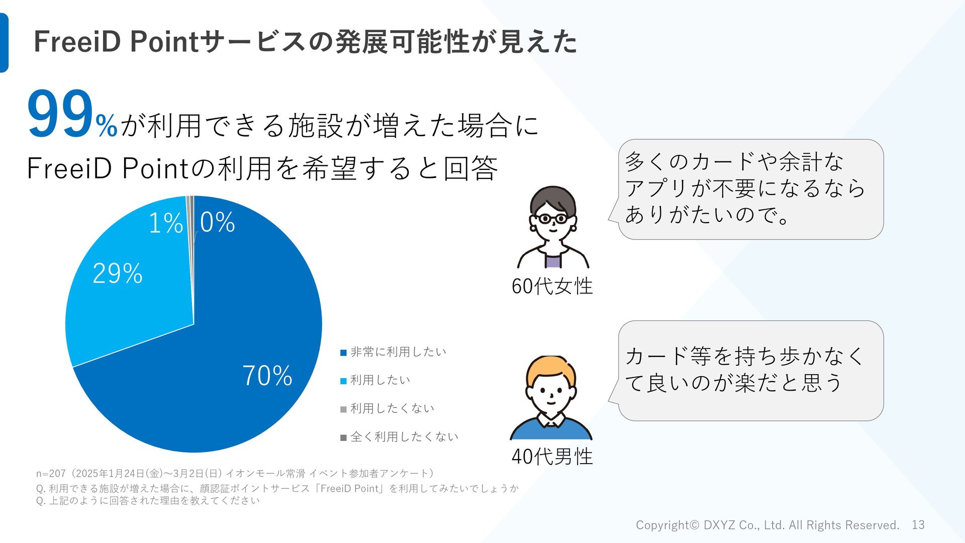 イオンモール常滑 イベント参加者アンケート) Q. 顔認証決済「FreeiD Pay」は、顔だけで買えるので、普段よりも財布の紐が緩んでしまった 65% 18% 17% はい どちらでもない いいえ 65%が普段よりも財布の紐が 緩んでしまったと回答 FreeiD Payはその他決済より 7%平均決済単価が高い結果 ※FreeiD Pay以外の決済手段も提供した店舗の2月22日~2月24日の売上実績を元に比較 FreeiD Pay その他決済 比率 西利 平均客単価 1,422 639 222% 決済回数 105 33 - 世界の山ちゃん 平均客単価 2,003 1,797 111% 決済回数 187 146 - 佐藤醸造 平均客単価 924 767 120% 決済回数 147 51 - 計 平均客単価 1,503 1,403 107% 決済回数 439 230 -