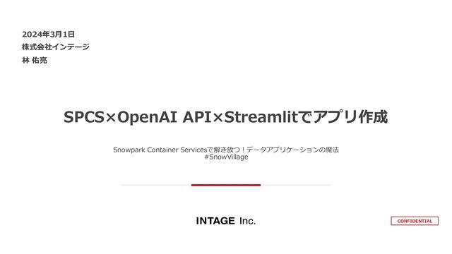 Snowpark Container Servicesで解き放つ︕データアプリケーションの魔法 #SnowVillage SPCS×OpenAI API×Streamlitでアプリ作成 2024年3⽉1⽇ 株式会社インテージ 林 佑亮