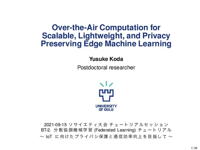 M. Morikura, “Differentially private aircomp federated learning with power adaptation harnessing receiver noise,” in Proc. IEEE GLOBECOM 2020, Held online, 2020, pp. 1–6. [2] G. Zhu, Y. Wang, and K. Huang, “Broadband analog aggregation for low-latency federated edge learning,” IEEE Trans. Wirel. Commun., vol. 19, no. 1, pp. 491–506, Oct. 2019. [3] R. C. Buck, “Approximate complexity and functional representation.,” Wisconsin Univ. Madison Mathematics Research Center, Tech. Rep., 1976. [4] M. Goldenbaum, H. Boche, and S. Sta´ nczak, “Harnessing interference for analog function computation in wireless sensor networks,” IEEE Trans. Signal Process., vol. 61, no. 20, pp. 4893–4906, Oct. 2013. [5] S. Limmer, J. Mohammadi, and S. Sta´ nczak, “A simple algorithm for approximation by nomographic functions,” in Proc. IEEE Allerton 2015, Monticello, IL, USA, Sep. 2015, pp. 453–458. [6] L. Phong, Y. Aono, T. Hayashi, L. Wang, and S. Moriai, “Privacy-preserving deep learning via additively homomorphic encryption,” IEEE Trans. Inf. Forensics Secur., vol. 13, no. 5, pp. 1333–1345, May 2018. [7] W. Luping, W. Wei, and L. Bo, “CMFL: Mitigating communication overhead for federated learning,” in Proc. IEEE ICDCS 2019, Richardson, TX, USA, Jul. 2019, pp. 954–964. [8] C. Dwork, A. Roth, et al., “The algorithmic foundations of differential privacy,” Found. Trends Theor. Comput. Sci., vol. 9, no. 3–4, pp. 211–407, Aug. 2014. [9] C. Dwork, G. N. Rothblum, and S. Vadhan, “Boosting and differential privacy,” in Proc. IEEE FOCS 2010, Las Vegas, NV, USA, Oct. 2010, pp. 51–60. 38 / 38