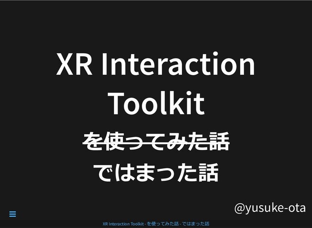 地域おこしXR研究会第5回勉強会発表資料 XR Interaction Toolkitを使ってみた話をしたかったのですが、ドキュメントがなくてはまりまくったので、機能と設定時の注意点を記載します。 デモ用プロジェクトURL: https://github.com/yusuke-ota/XRShimaneLT-XRInteractionToolkit.git