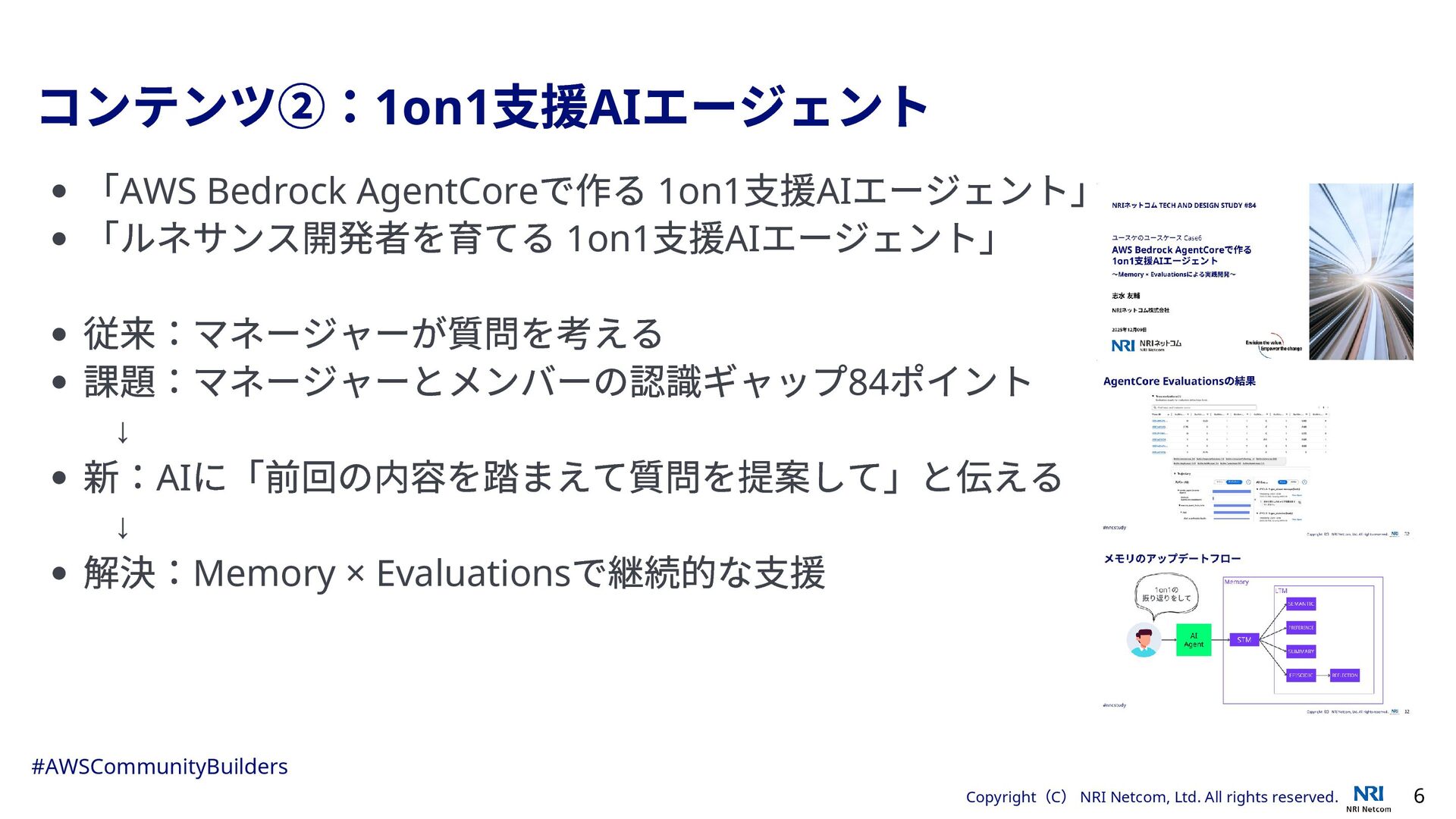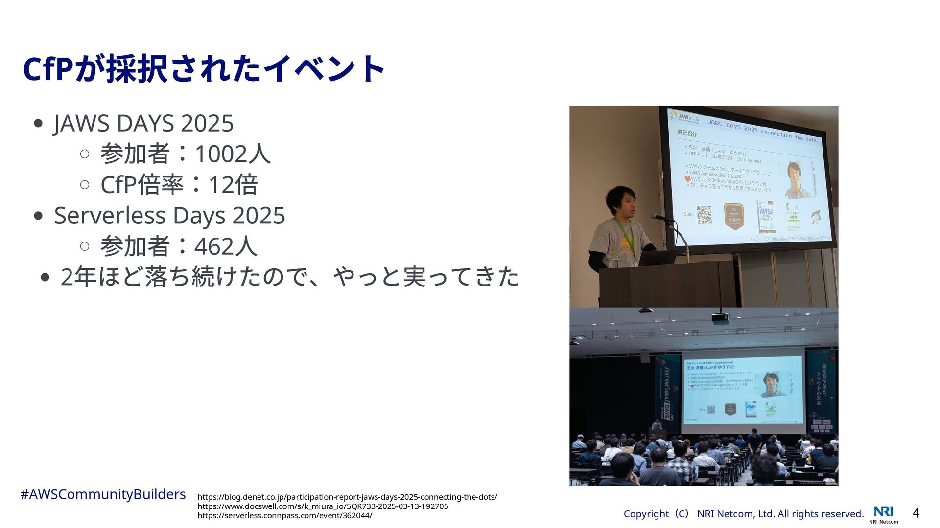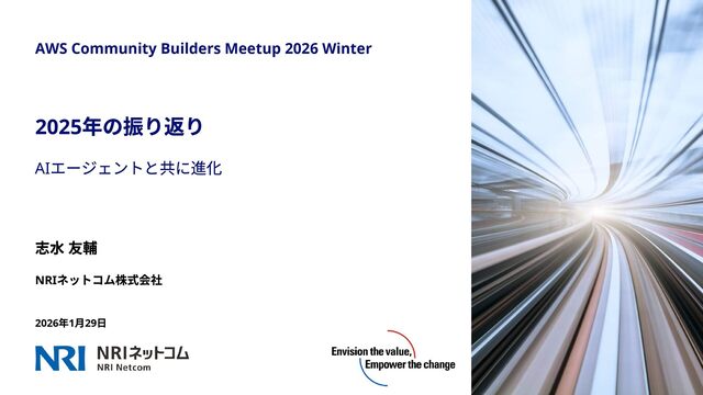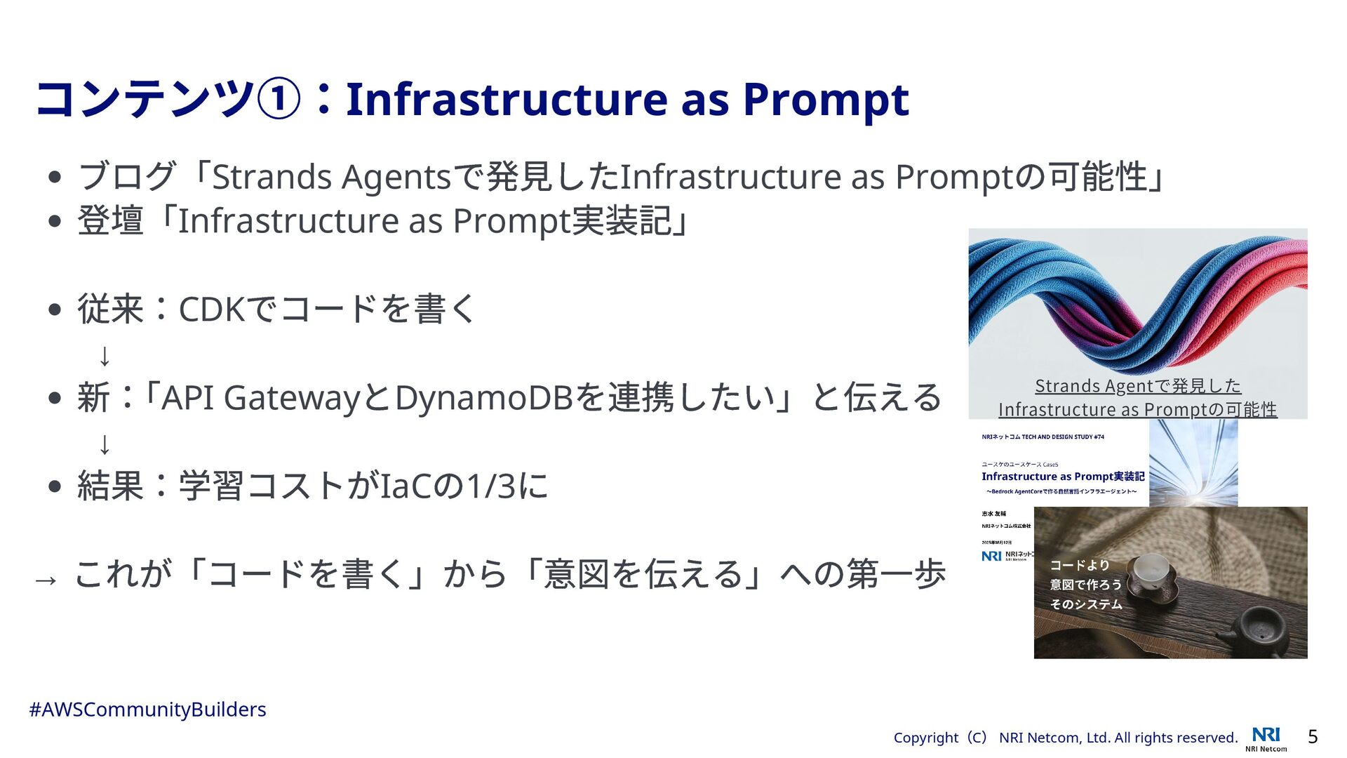 年の活動実績 3 ブログ記事(3 本) Strands Agents で発見したInfrastructure as Prompt の可能性 AWS 受賞者分析エージェントをStrands Agents で作ってみた Kiro をコーディング以外で活用する 登壇(8 本) 「完璧を目指さない」サーバーレス進化論 AWS Bedrock AgentCore で作る 1on1 支援AI エージェント その他6 本(Infrastructure as Prompt 実装記、Slack ブログ校正、AWS インターフェース進化論など) 初めてのパネルディスカッション(1 本) Ambassadors に聞くクラウドリフト・モダナイズの処方箋(AWS ぶっち ゃけ討論会vol.4 ) #AWSCommunityBuilders