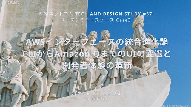 AWS SDK/CLI - スクリプトによる直接操作 - 自動化の容易さ AWS CloudFormation/AWS CDK - コードによる状態定義 - べき等性の確保 GUI AWS Management Console - 視覚的な直接操作 - 即時フィードバック AWS CloudFormation Designer - 視覚的な状態定義 - 依存関係の図示 NLUI Amazon Q - 自然言語による操作指示 - コンテキスト考慮 (現時点では未提供) AWSインターフェースの統合進化論 転載、複製、改変等は禁止します #nncstudy