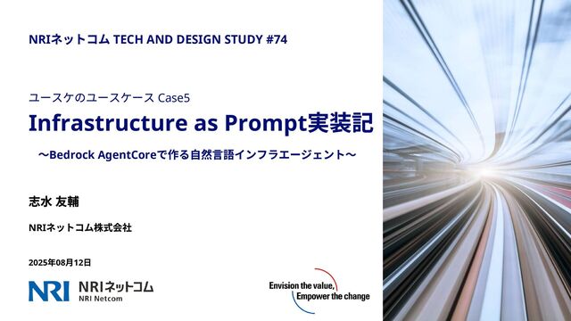 ユーザ承認が必要 create/update 系はユーザの入力が必要(use_aws の仕様) 環境変数のBYPASS_TOOL_CONSENT をtrue にする必要あり MCP サーバーの実行環境 AgentCore Runtime 上でuv コマンドを利用してMCP サーバへ接続 uv コマンドが無くエラーになる エージェントデプロイ時に利用するパッケージにuv を追加 IAM 権限の設定 チャットでリソース作成依頼をすると権限で作成できない AgentCore Runtime に付与されているIAM Role にポリシーを追加 #nncstudy