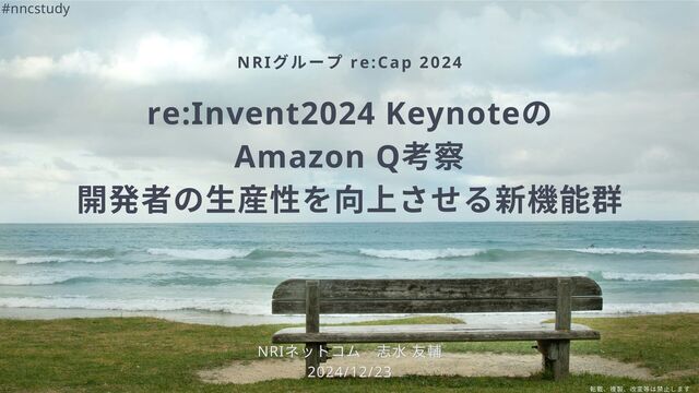unit tests Amazon Q generates accurate documentation Amazon Q performs code reviews GitLab Duo with Amazon Q Amazon Q Developer: Investigate issues across your AWS environment in a fraction of the time Amazon Q Developer: Transform .NET applications from Windows to Linux Amazon Q Developer: Transform VMware workloads to cloud native architectures Amazon Q Developer: Transform mainframe applications to accelerate migrations Keynoteで発表されたAmazon Q機能群 転載、複製、改変等は禁止します 開発生産性を向上させる基本機能 運用効率を改善する機能 システムモダナイゼーションを 加速する機能 #nncstudy