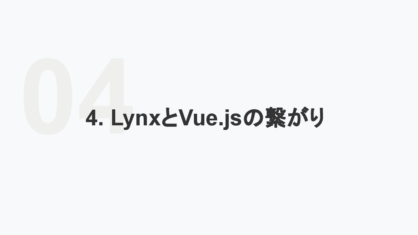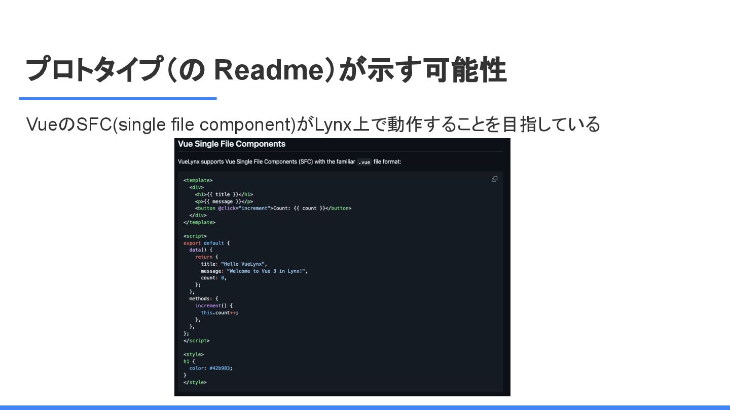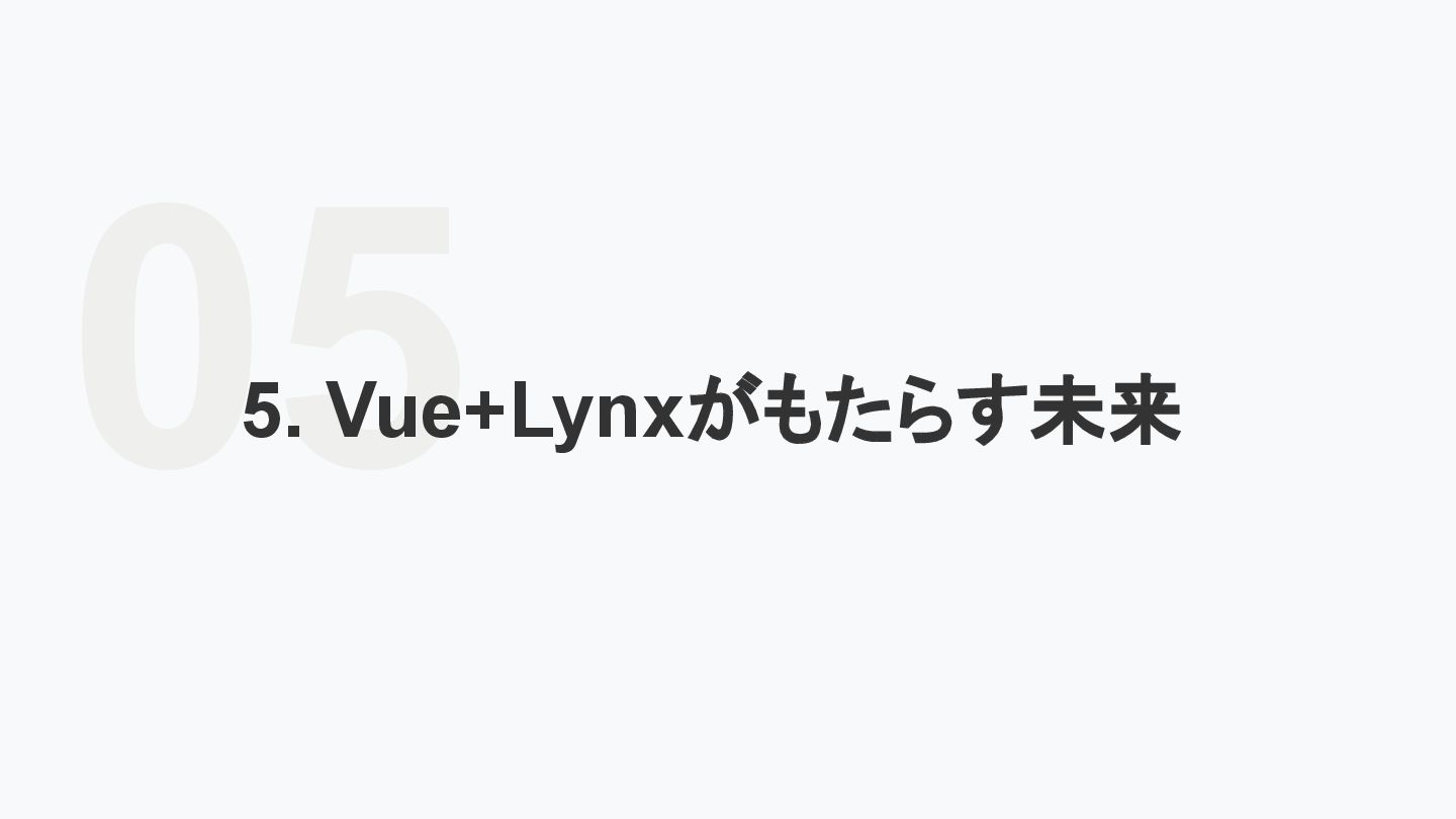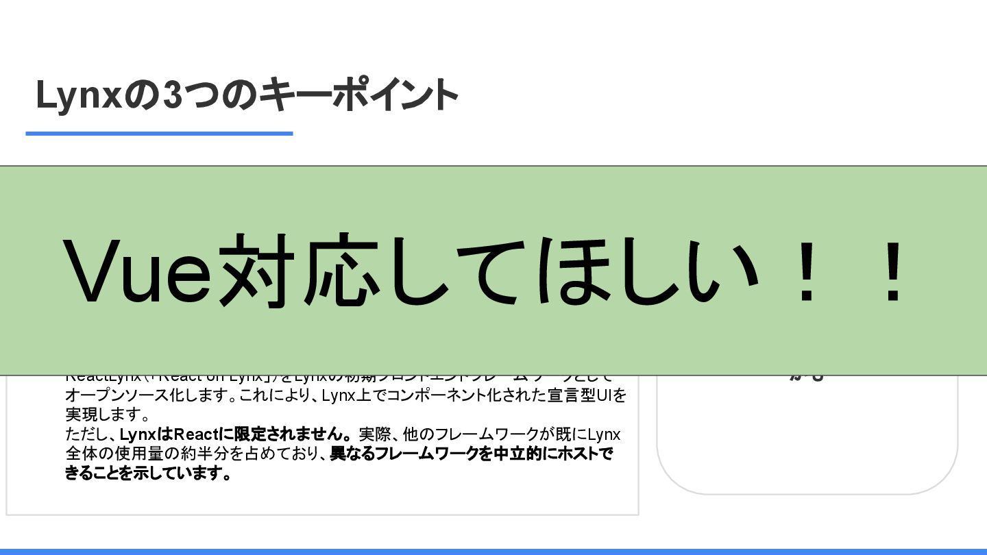 レームワーク 複数のJSフレームワークへの 対応 現在はReactにのみ対応だ が、React以外にも対応する かも <Lynx公式から引用 ※太字は発表者による > We are open-sourcing ReactLynx (“React on Lynx”) as Lynx’s initial frontend framework flavor, enabling componentized, declarative UI on Lynx. However, Lynx isn’t limited to React. In fact, other frameworks already represent roughly half of Lynx’s overall usage, demonstrating its neutrality in hosting different flavors. ReactLynx(「React on Lynx」)をLynxの初期フロントエンドフレームワークとして オープンソース化します。これにより、Lynx上でコンポーネント化された宣言型UIを 実現します。 ただし、LynxはReactに限定されません。 実際、他のフレームワークが既にLynx 全体の使用量の約半分を占めており、異なるフレームワークを中立的にホストで きることを示しています。 Vue対応してほしい!!