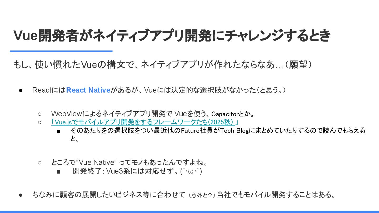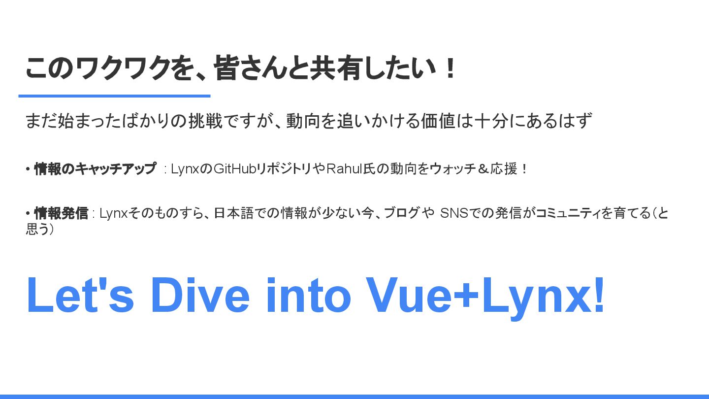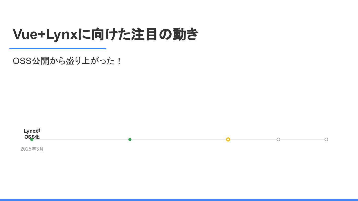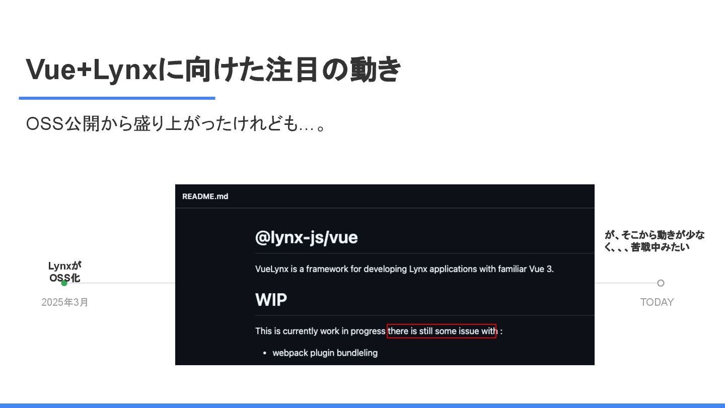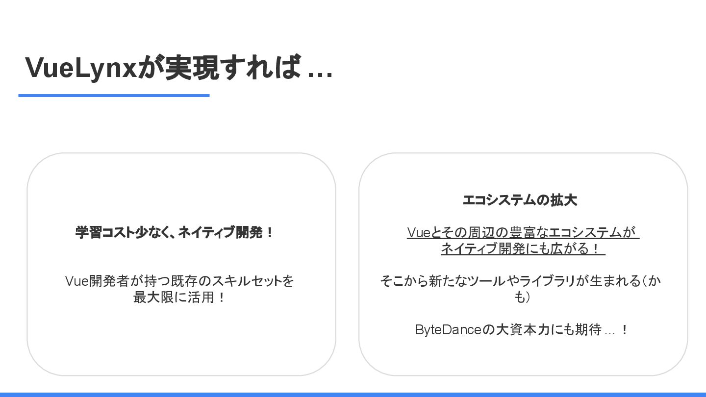 レームワーク 複数のJSフレームワークへの 対応 現在はReactにのみ対応だ が、React以外にも対応する かも <Lynx公式から引用 ※太字は発表者による > We are open-sourcing ReactLynx (“React on Lynx”) as Lynx’s initial frontend framework flavor, enabling componentized, declarative UI on Lynx. However, Lynx isn’t limited to React. In fact, other frameworks already represent roughly half of Lynx’s overall usage, demonstrating its neutrality in hosting different flavors. ReactLynx(「React on Lynx」)をLynxの初期フロントエンドフレームワークとして オープンソース化します。これにより、Lynx上でコンポーネント化された宣言型UIを 実現します。 ただし、LynxはReactに限定されません。 実際、他のフレームワークが既にLynx 全体の使用量の約半分を占めており、異なるフレームワークを中立的にホストで きることを示しています。 Vue対応してほしい!!