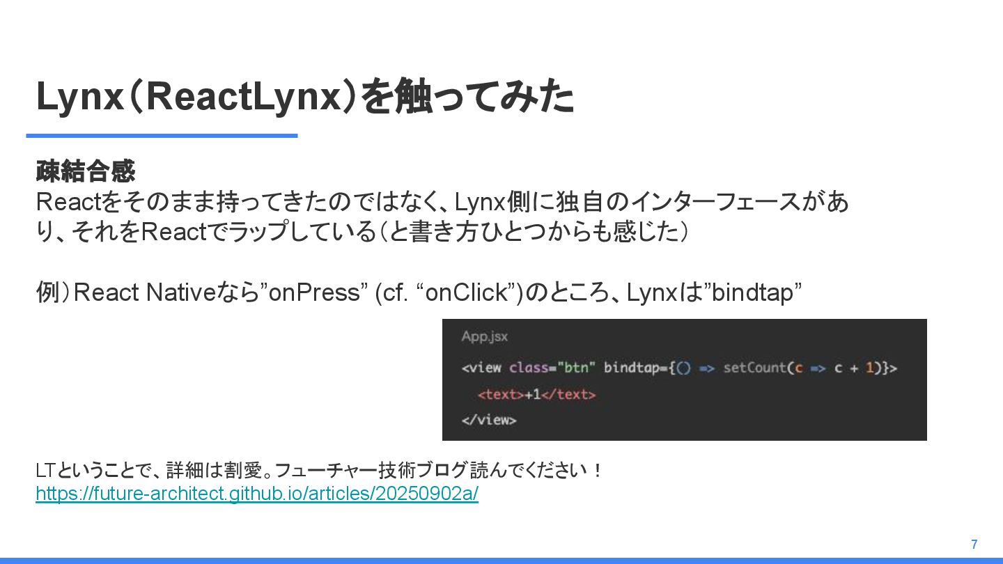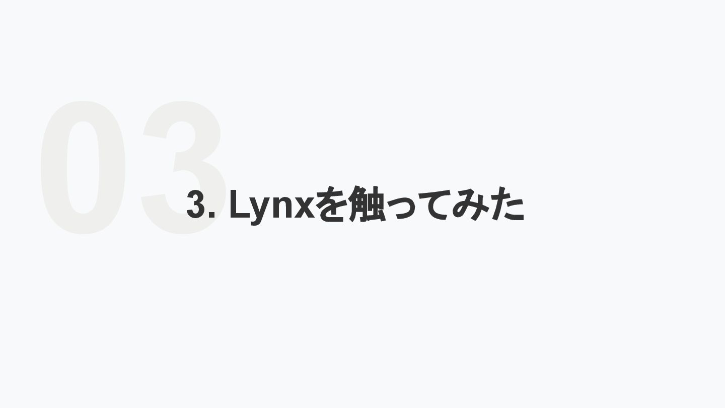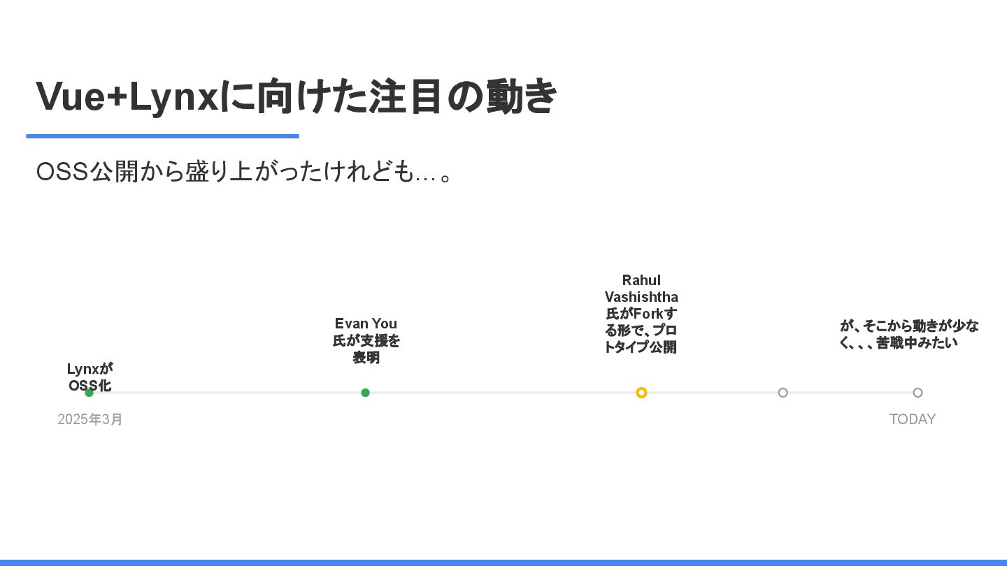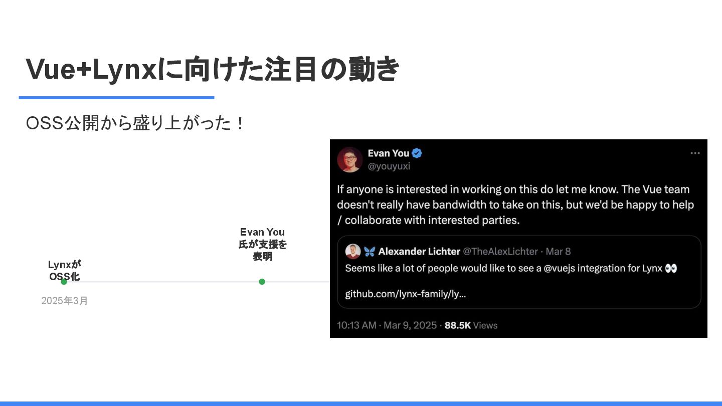 レームワーク 複数のJSフレームワークへの 対応 現在はReactにのみ対応だ が、React以外にも対応する かも <Lynx公式から引用 ※太字は発表者による > We are open-sourcing ReactLynx (“React on Lynx”) as Lynx’s initial frontend framework flavor, enabling componentized, declarative UI on Lynx. However, Lynx isn’t limited to React. In fact, other frameworks already represent roughly half of Lynx’s overall usage, demonstrating its neutrality in hosting different flavors. ReactLynx(「React on Lynx」)をLynxの初期フロントエンドフレームワークとして オープンソース化します。これにより、Lynx上でコンポーネント化された宣言型UIを 実現します。 ただし、LynxはReactに限定されません。 実際、他のフレームワークが既にLynx 全体の使用量の約半分を占めており、異なるフレームワークを中立的にホストで きることを示しています。 Vue対応してほしい!!