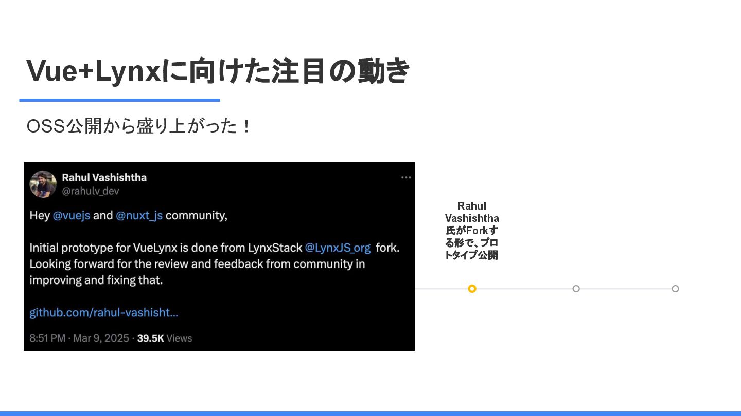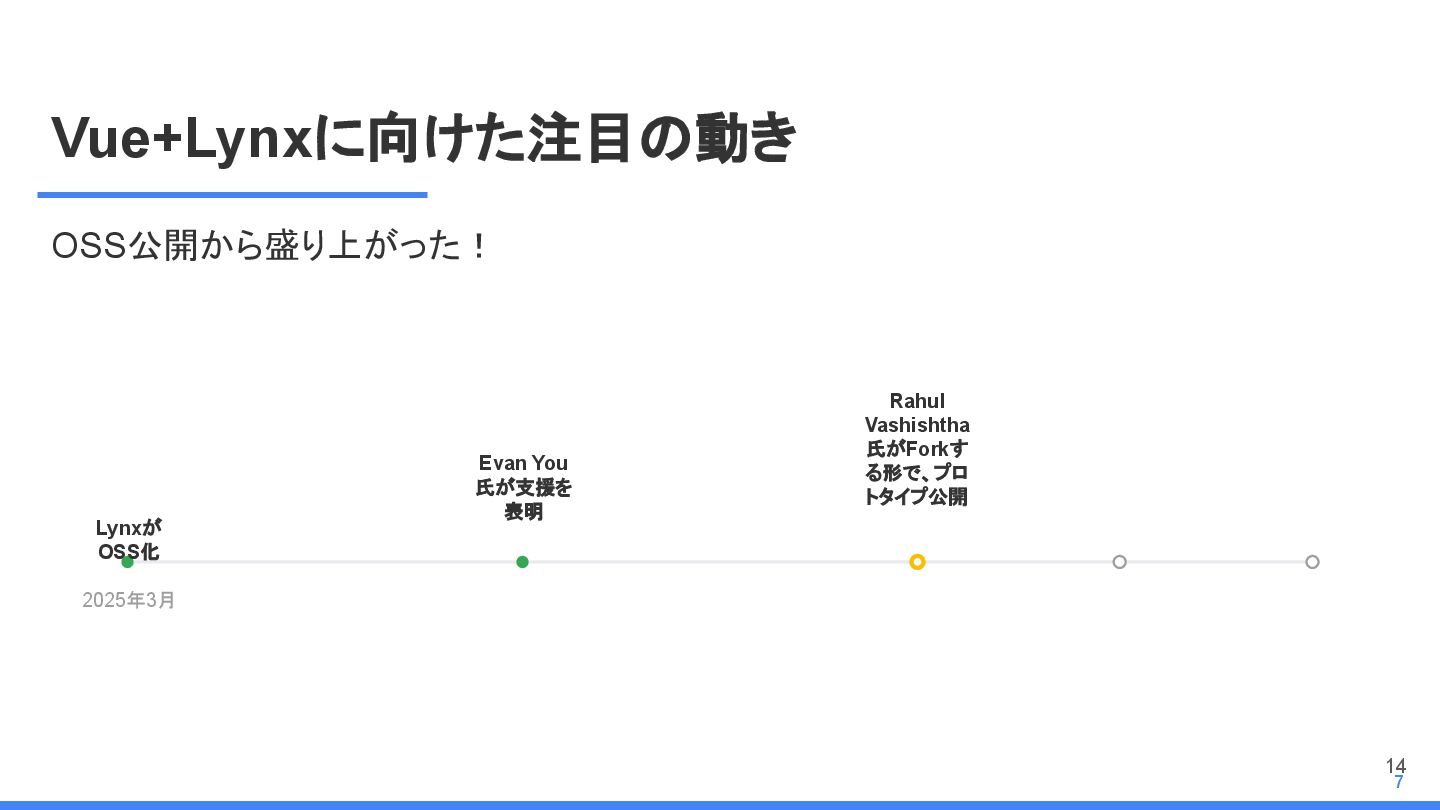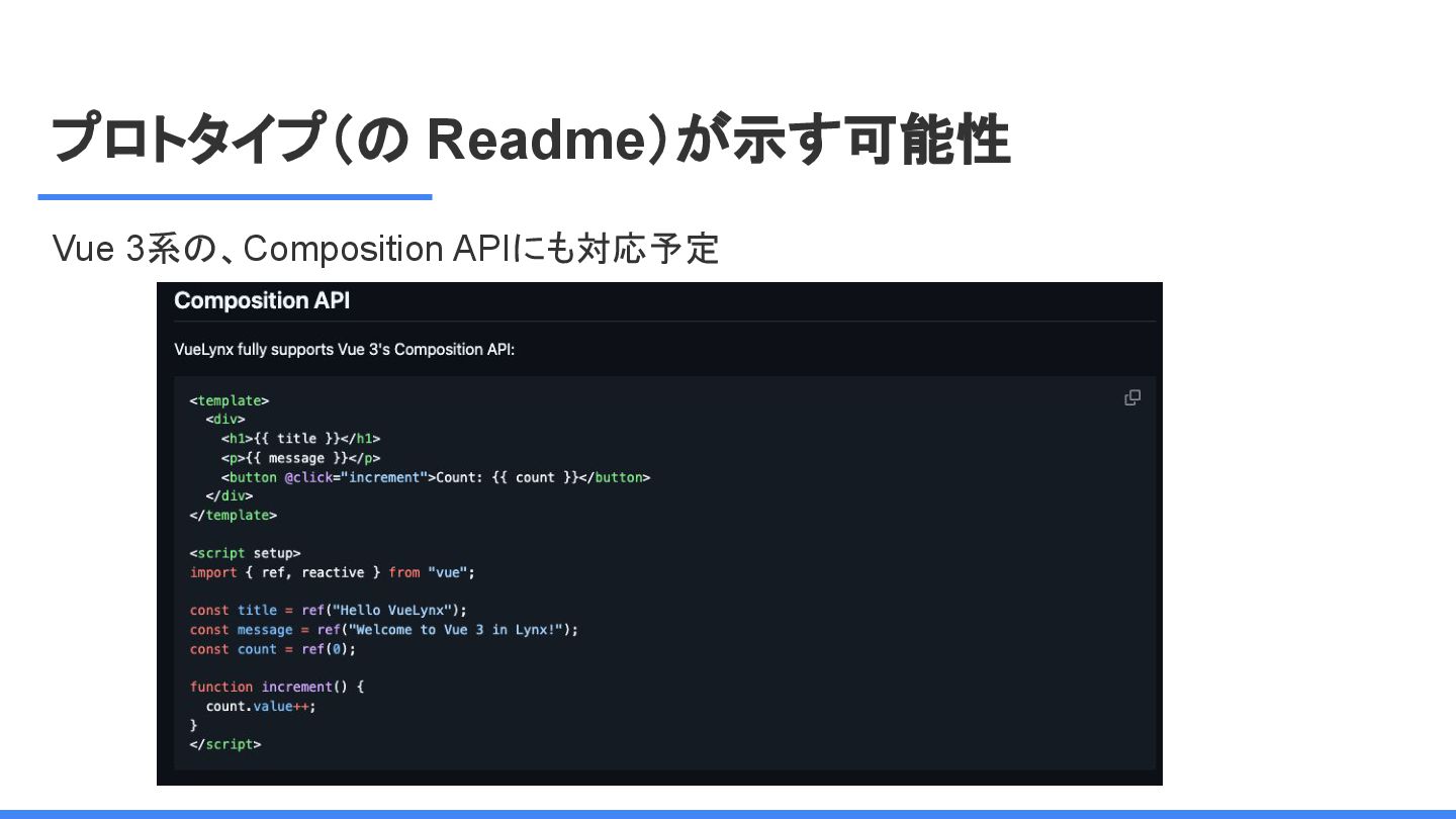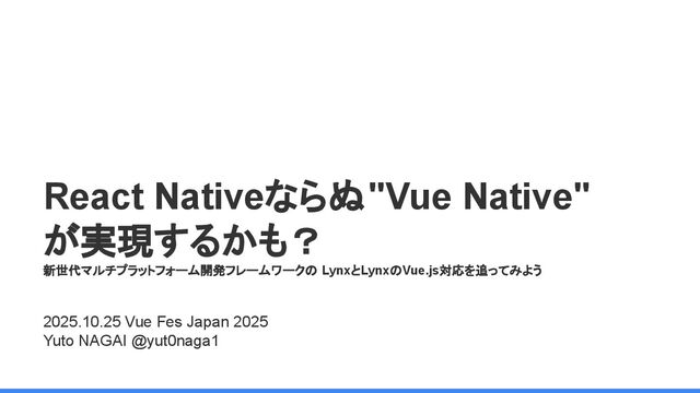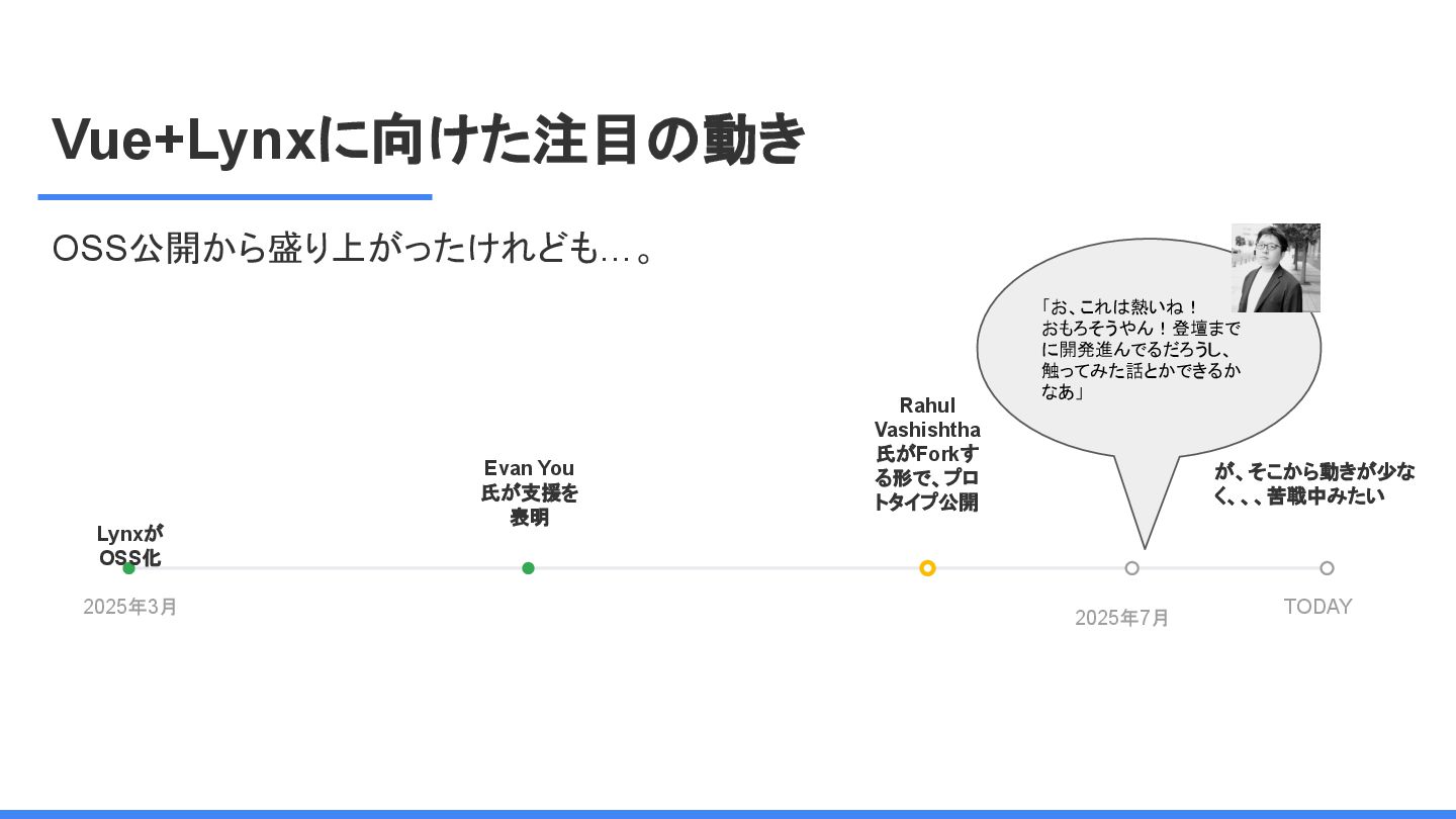 レームワーク 複数のJSフレームワークへの 対応 現在はReactにのみ対応だ が、React以外にも対応する かも <Lynx公式から引用 ※太字は発表者による > We are open-sourcing ReactLynx (“React on Lynx”) as Lynx’s initial frontend framework flavor, enabling componentized, declarative UI on Lynx. However, Lynx isn’t limited to React. In fact, other frameworks already represent roughly half of Lynx’s overall usage, demonstrating its neutrality in hosting different flavors. ReactLynx(「React on Lynx」)をLynxの初期フロントエンドフレームワークとして オープンソース化します。これにより、Lynx上でコンポーネント化された宣言型UIを 実現します。 ただし、LynxはReactに限定されません。 実際、他のフレームワークが既にLynx 全体の使用量の約半分を占めており、異なるフレームワークを中立的にホストで きることを示しています。 Vue対応してほしい!!