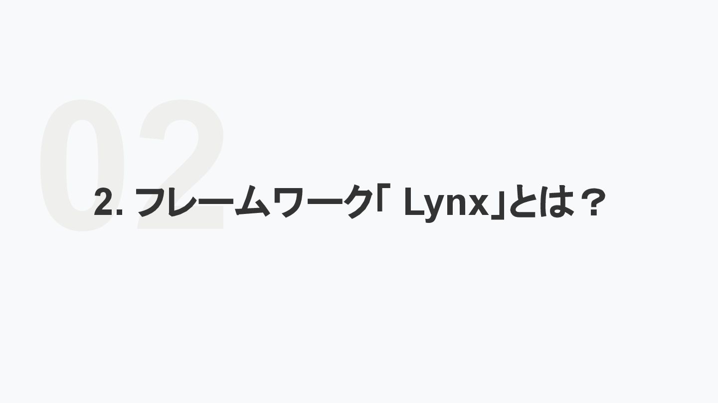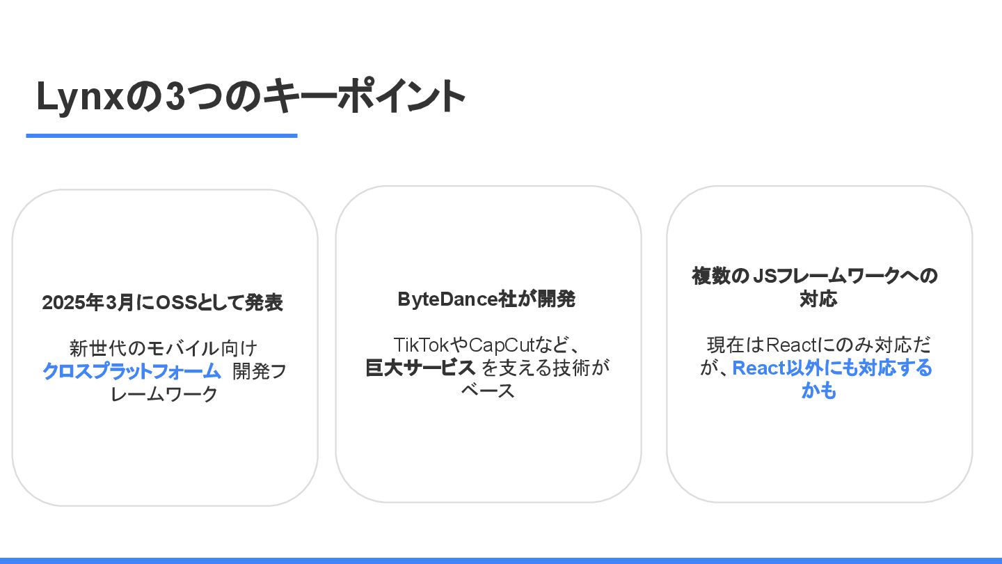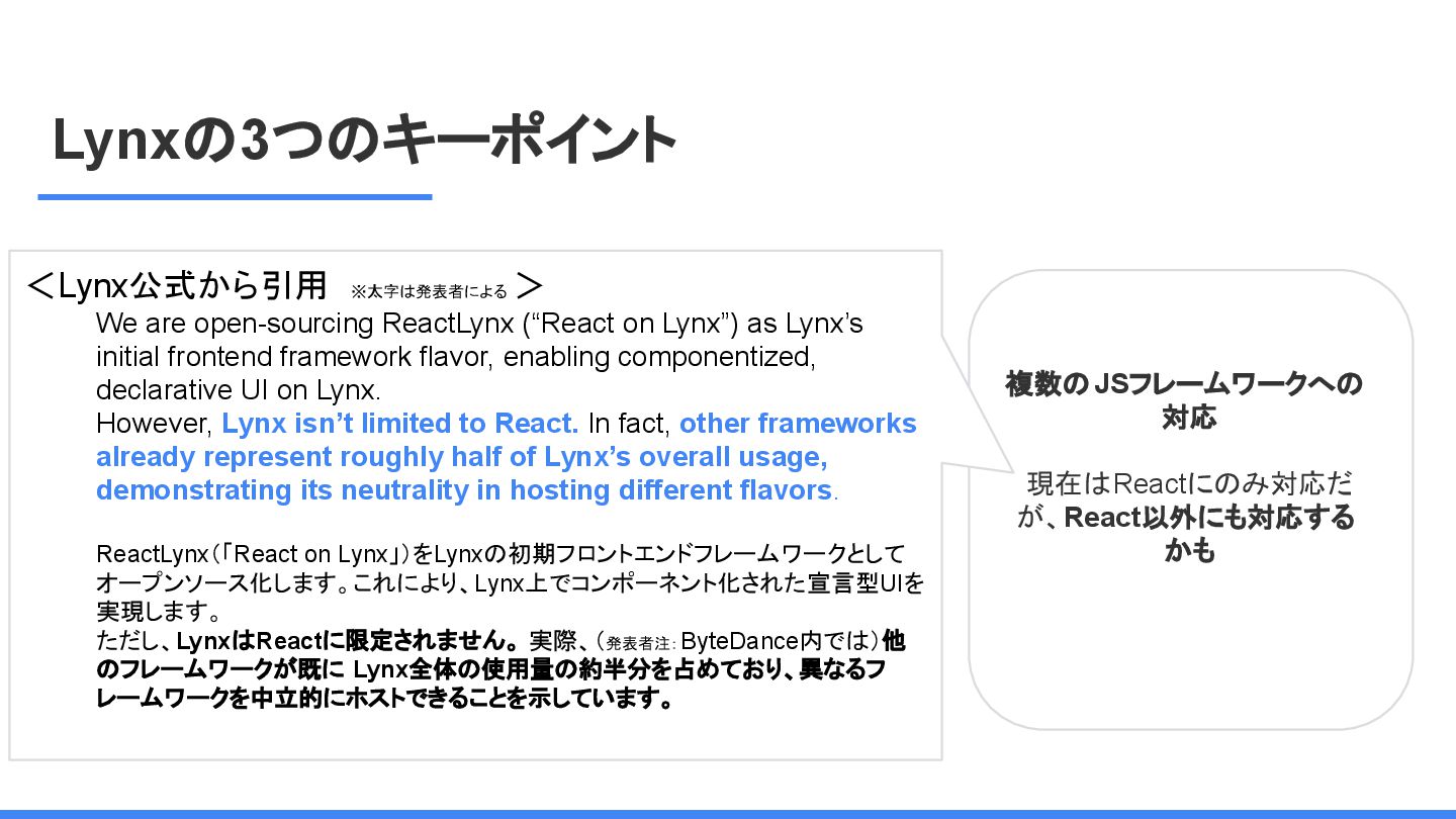 レームワーク 複数のJSフレームワークへの 対応 現在はReactにのみ対応だ が、React以外にも対応する かも <Lynx公式から引用 ※太字は発表者による > We are open-sourcing ReactLynx (“React on Lynx”) as Lynx’s initial frontend framework flavor, enabling componentized, declarative UI on Lynx. However, Lynx isn’t limited to React. In fact, other frameworks already represent roughly half of Lynx’s overall usage, demonstrating its neutrality in hosting different flavors. ReactLynx(「React on Lynx」)をLynxの初期フロントエンドフレームワークとして オープンソース化します。これにより、Lynx上でコンポーネント化された宣言型UIを 実現します。 ただし、LynxはReactに限定されません。 実際、(発表者注:ByteDance内では)他 のフレームワークが既に Lynx全体の使用量の約半分を占めており、異なるフ レームワークを中立的にホストできることを示しています。