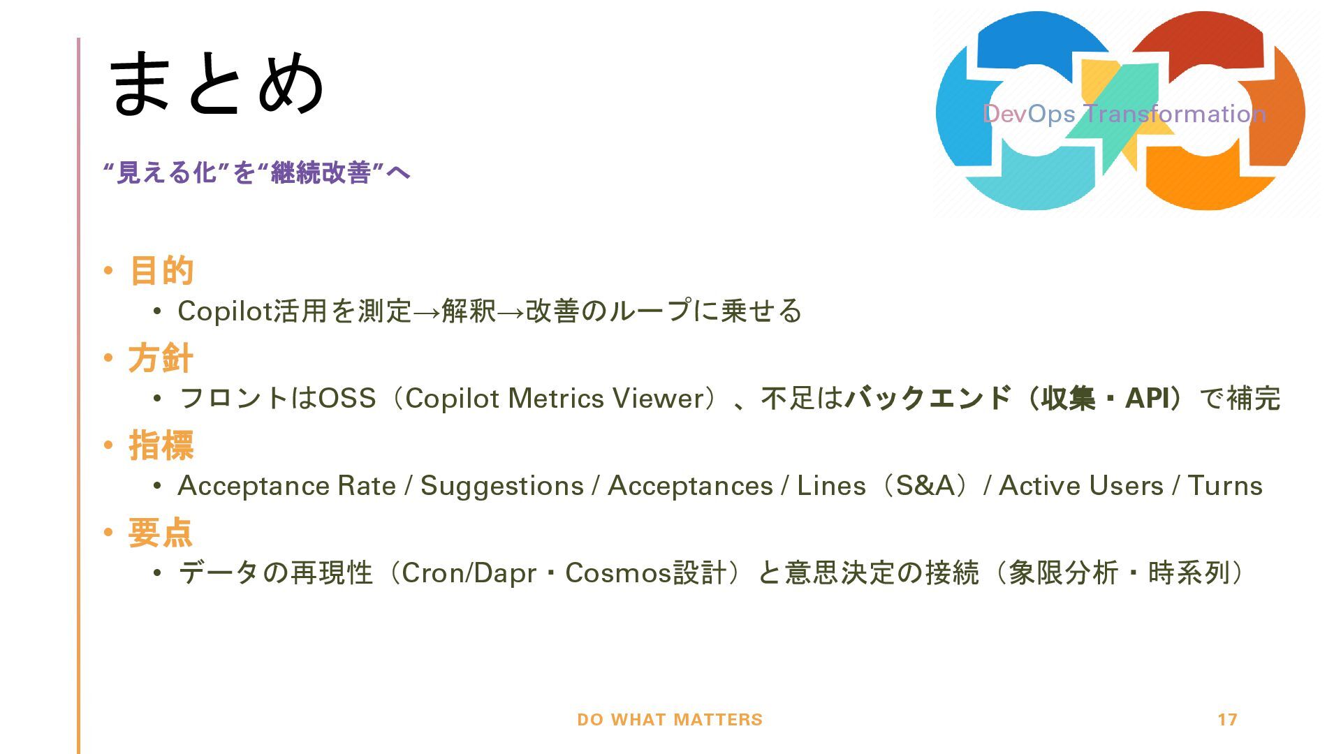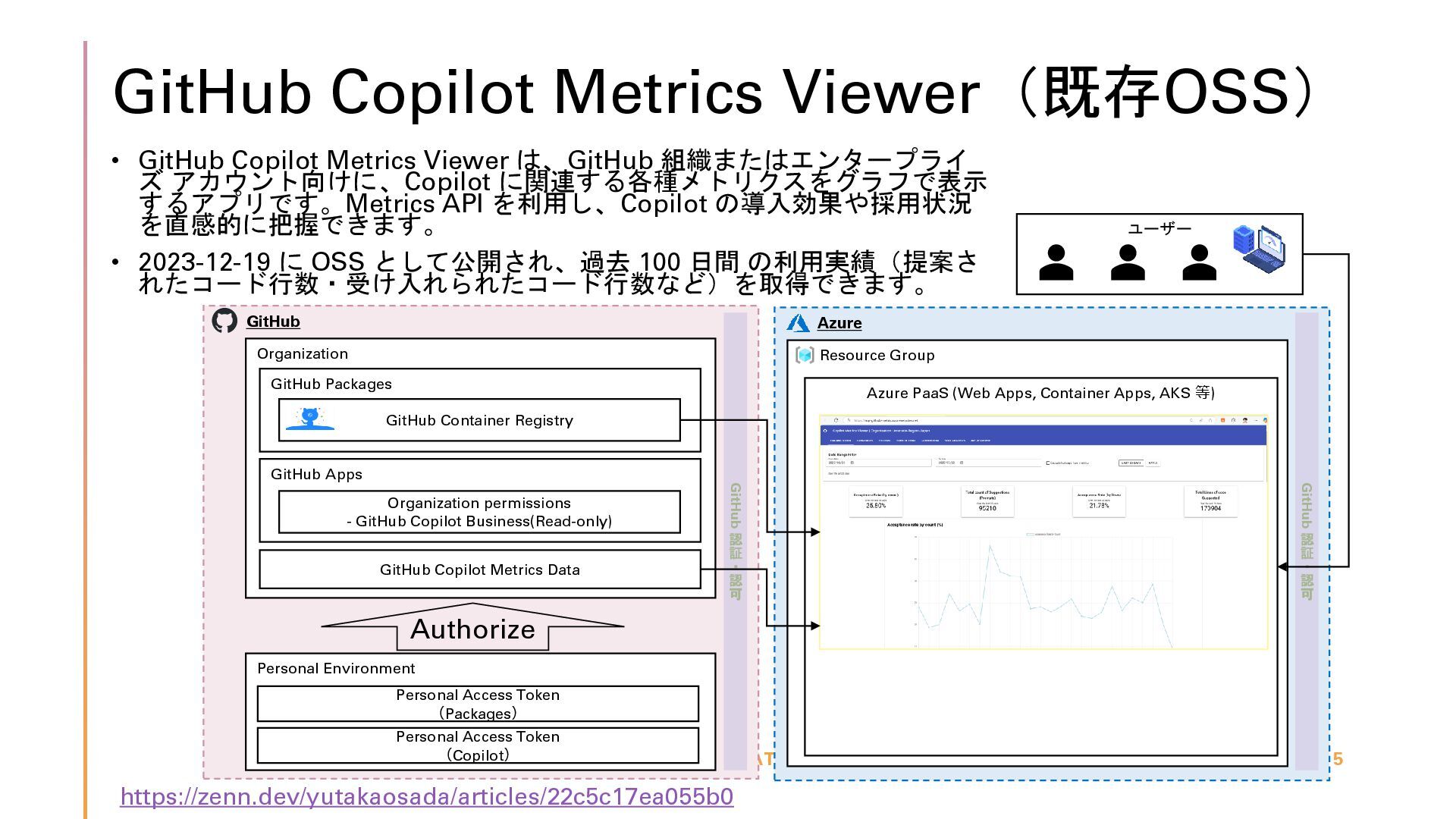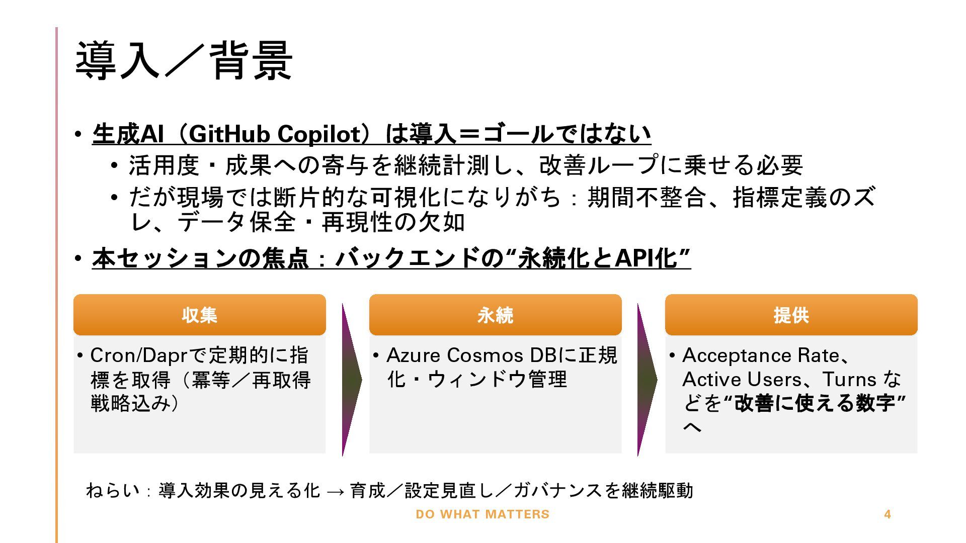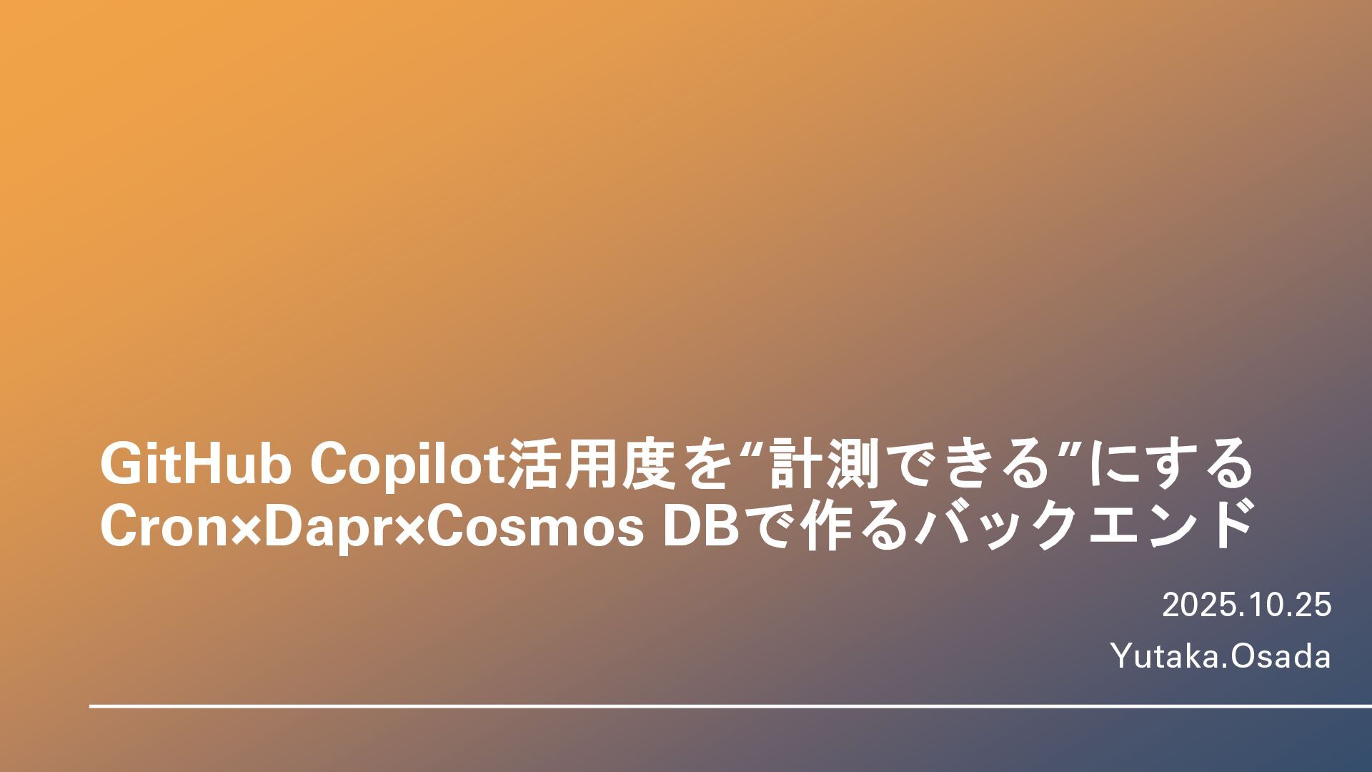 生成AIの実運用では「どれだけ使われ、成果に結びついているか」を継続的に測ることが不可欠です。本セッションでは、GitHub Copilotの利用データを定期収集し、Azure Cosmos DBへ永続化、APIで配信するバックエンド実装に焦点を当てます。Cron(Dapr)で収集を自動化し、最小構成のAPIでOSSのGitHub Copilot Metrics Viewerへ供給。Acceptance RateやActive Usersなどの指標を、DevOps視点で“継続改善に使える数字”へと転換する設計・運用の勘所を、アーキテクチャと実装の両面から解説します。