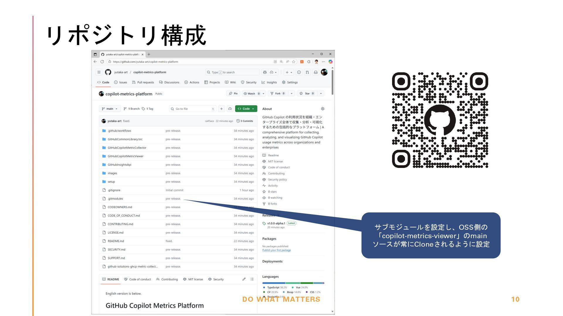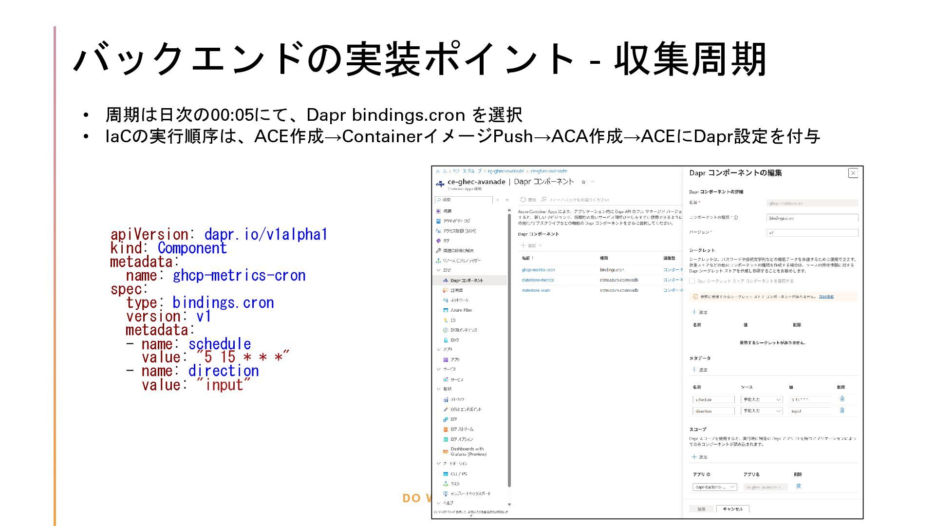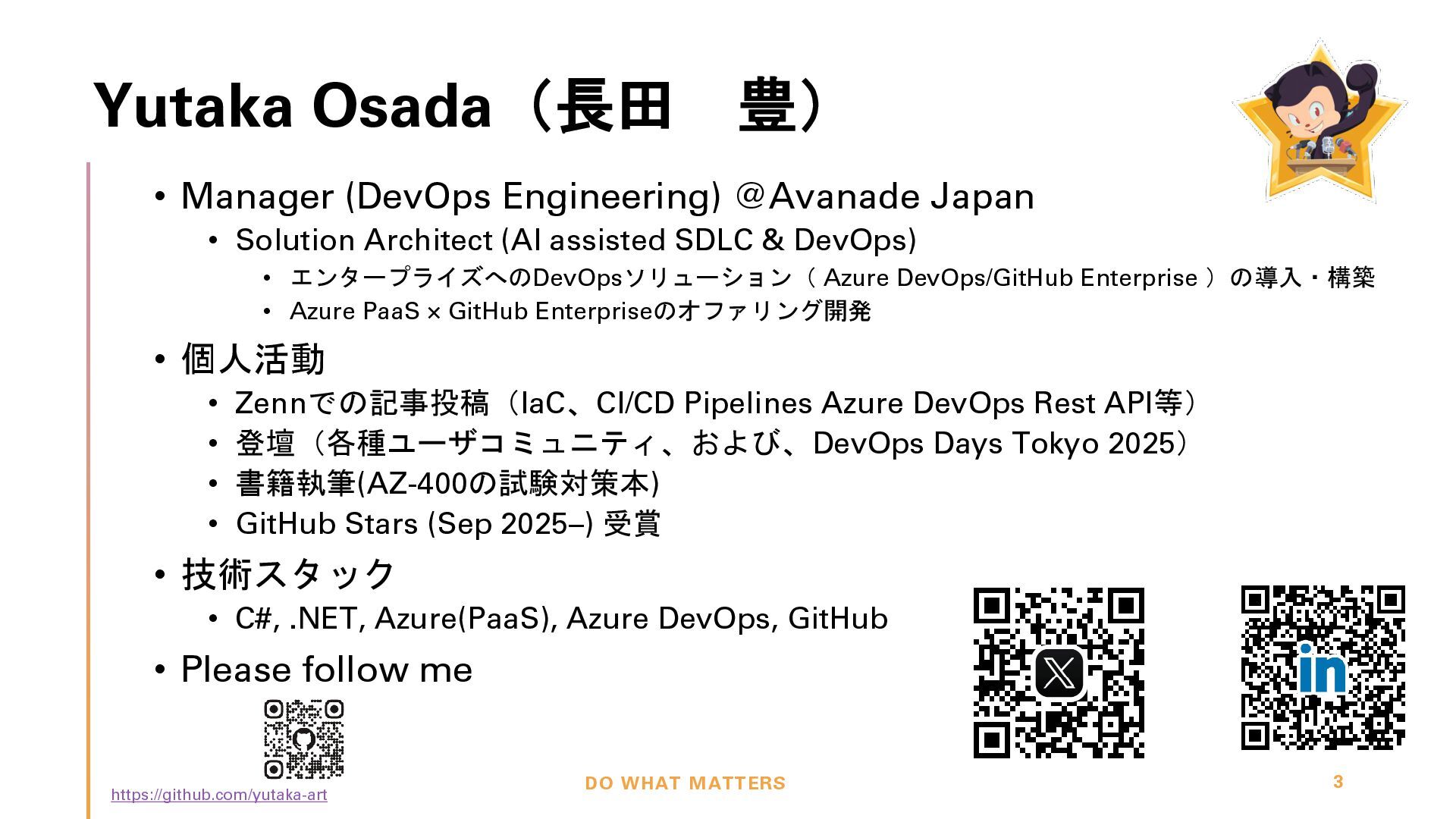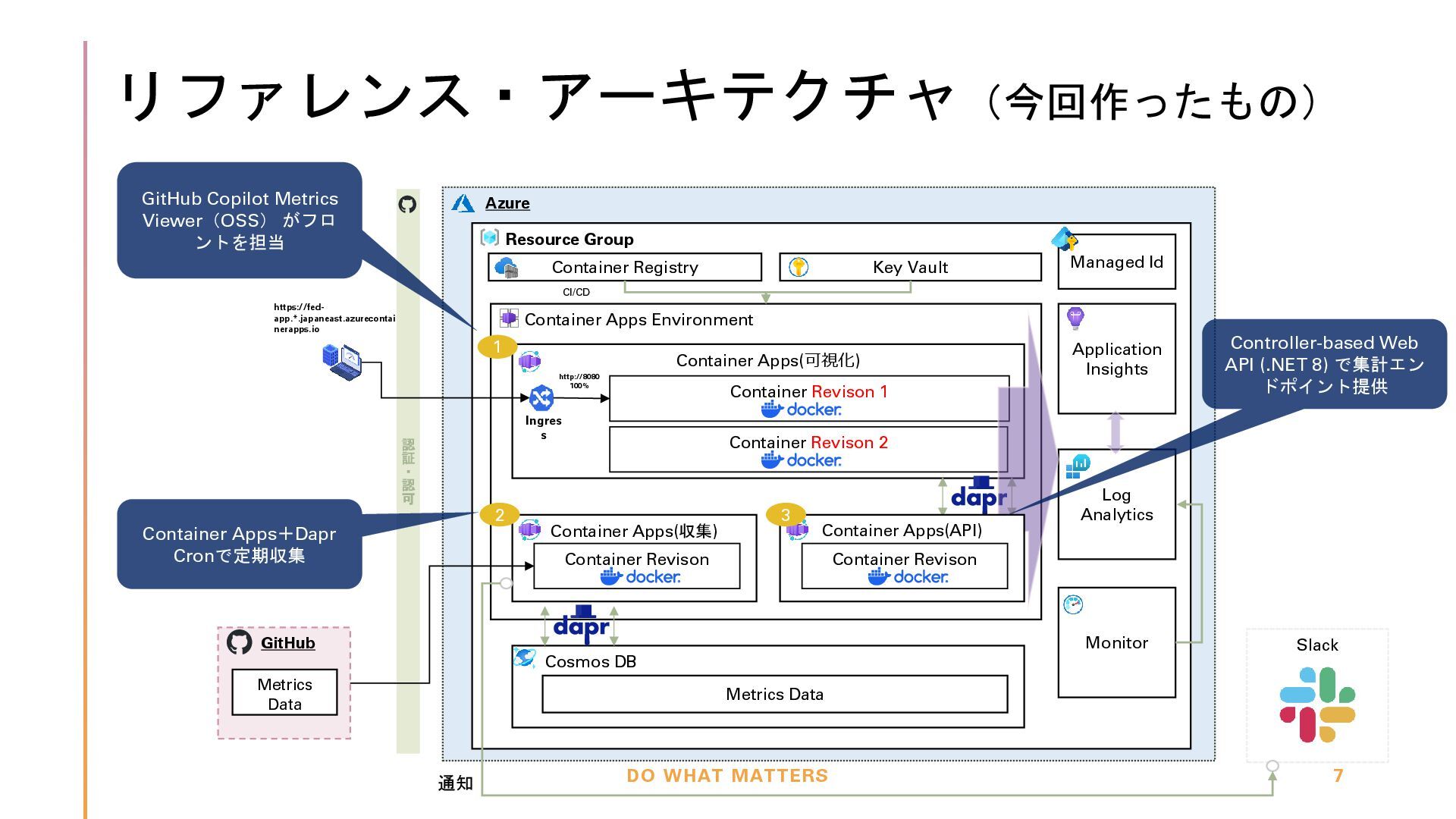 生成AIの実運用では「どれだけ使われ、成果に結びついているか」を継続的に測ることが不可欠です。本セッションでは、GitHub Copilotの利用データを定期収集し、Azure Cosmos DBへ永続化、APIで配信するバックエンド実装に焦点を当てます。Cron(Dapr)で収集を自動化し、最小構成のAPIでOSSのGitHub Copilot Metrics Viewerへ供給。Acceptance RateやActive Usersなどの指標を、DevOps視点で“継続改善に使える数字”へと転換する設計・運用の勘所を、アーキテクチャと実装の両面から解説します。