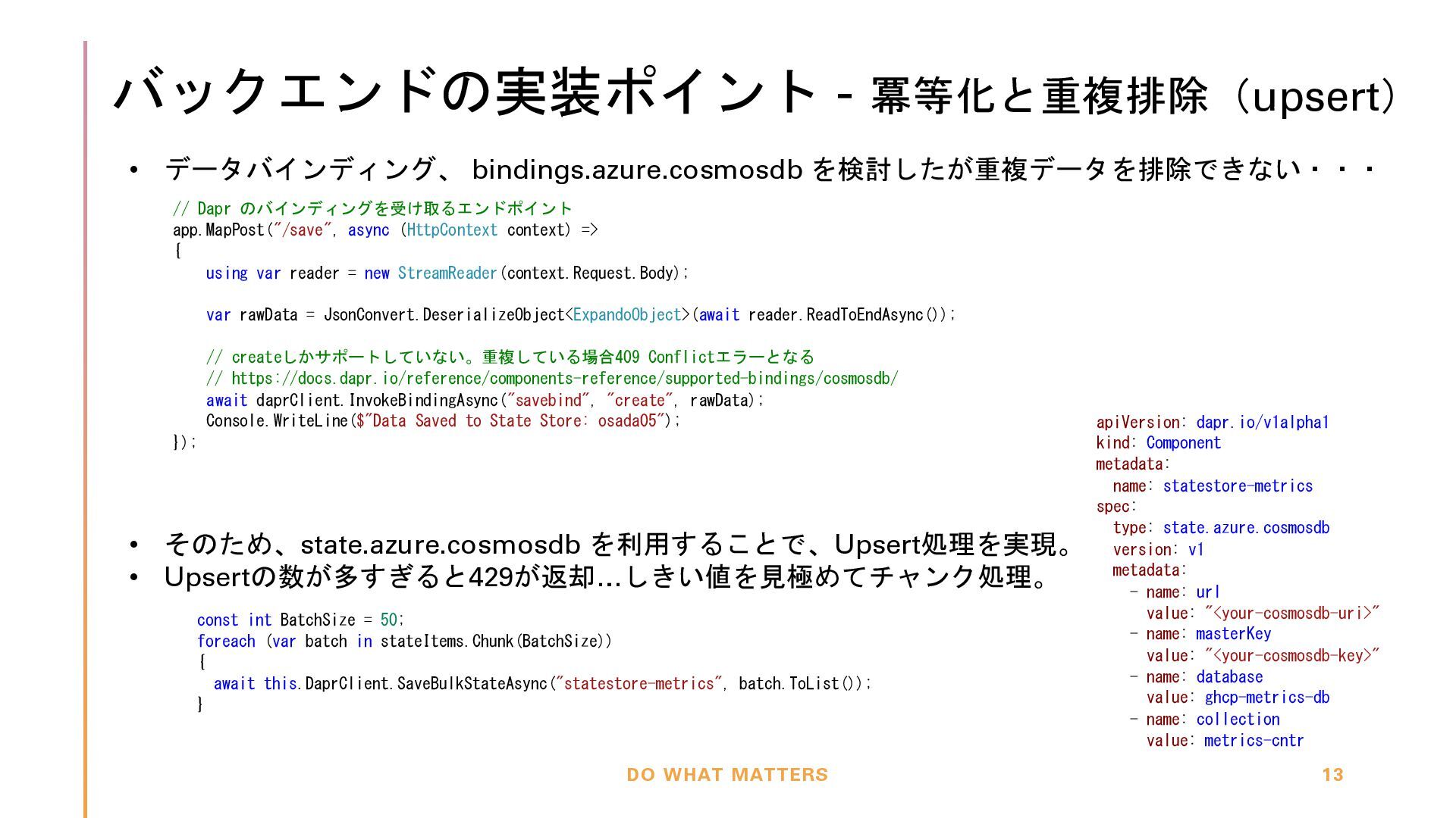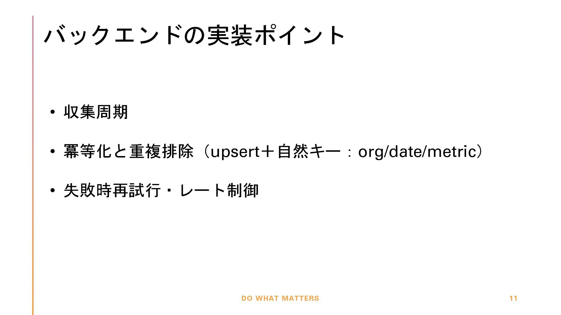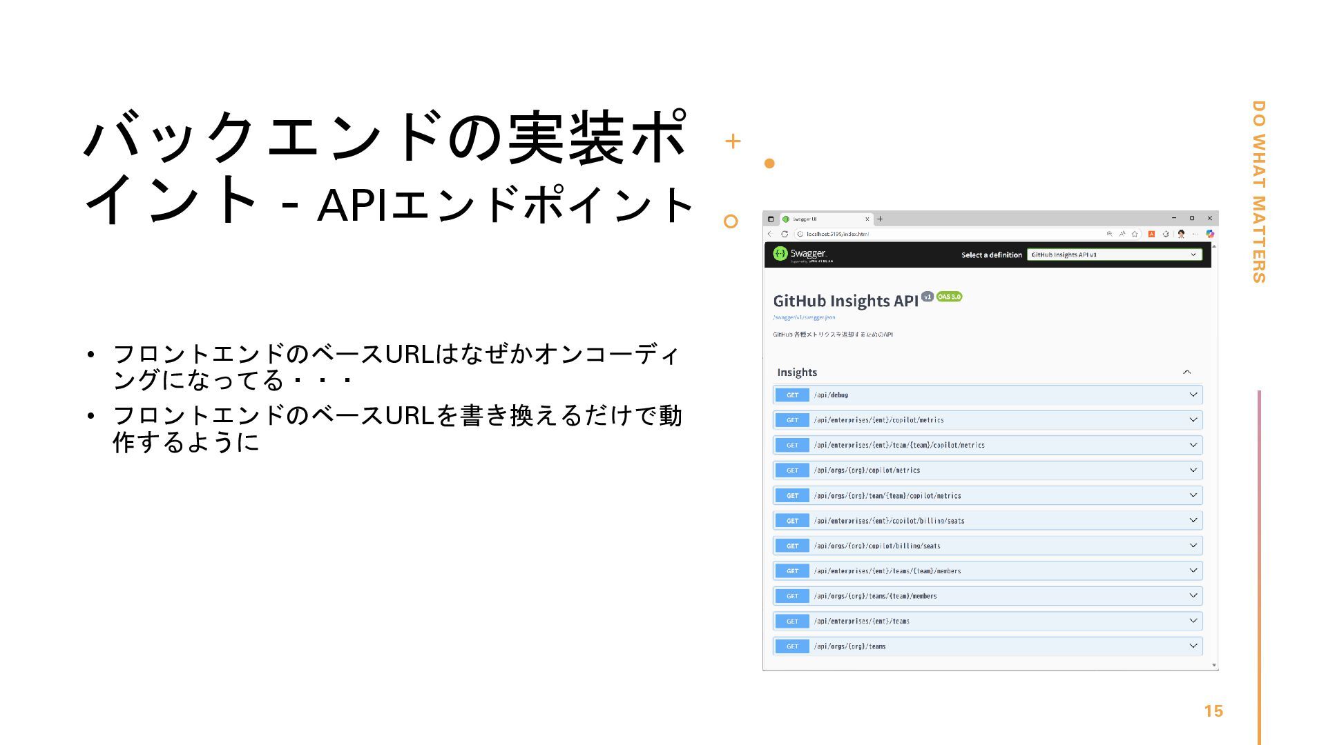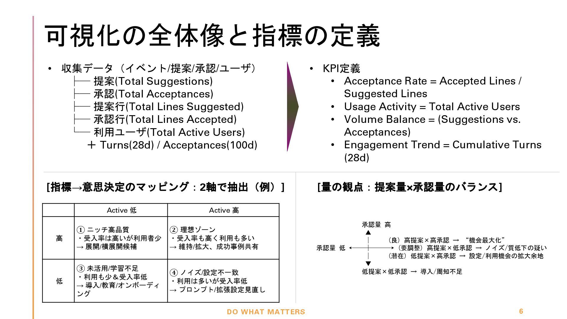 生成AIの実運用では「どれだけ使われ、成果に結びついているか」を継続的に測ることが不可欠です。本セッションでは、GitHub Copilotの利用データを定期収集し、Azure Cosmos DBへ永続化、APIで配信するバックエンド実装に焦点を当てます。Cron(Dapr)で収集を自動化し、最小構成のAPIでOSSのGitHub Copilot Metrics Viewerへ供給。Acceptance RateやActive Usersなどの指標を、DevOps視点で“継続改善に使える数字”へと転換する設計・運用の勘所を、アーキテクチャと実装の両面から解説します。