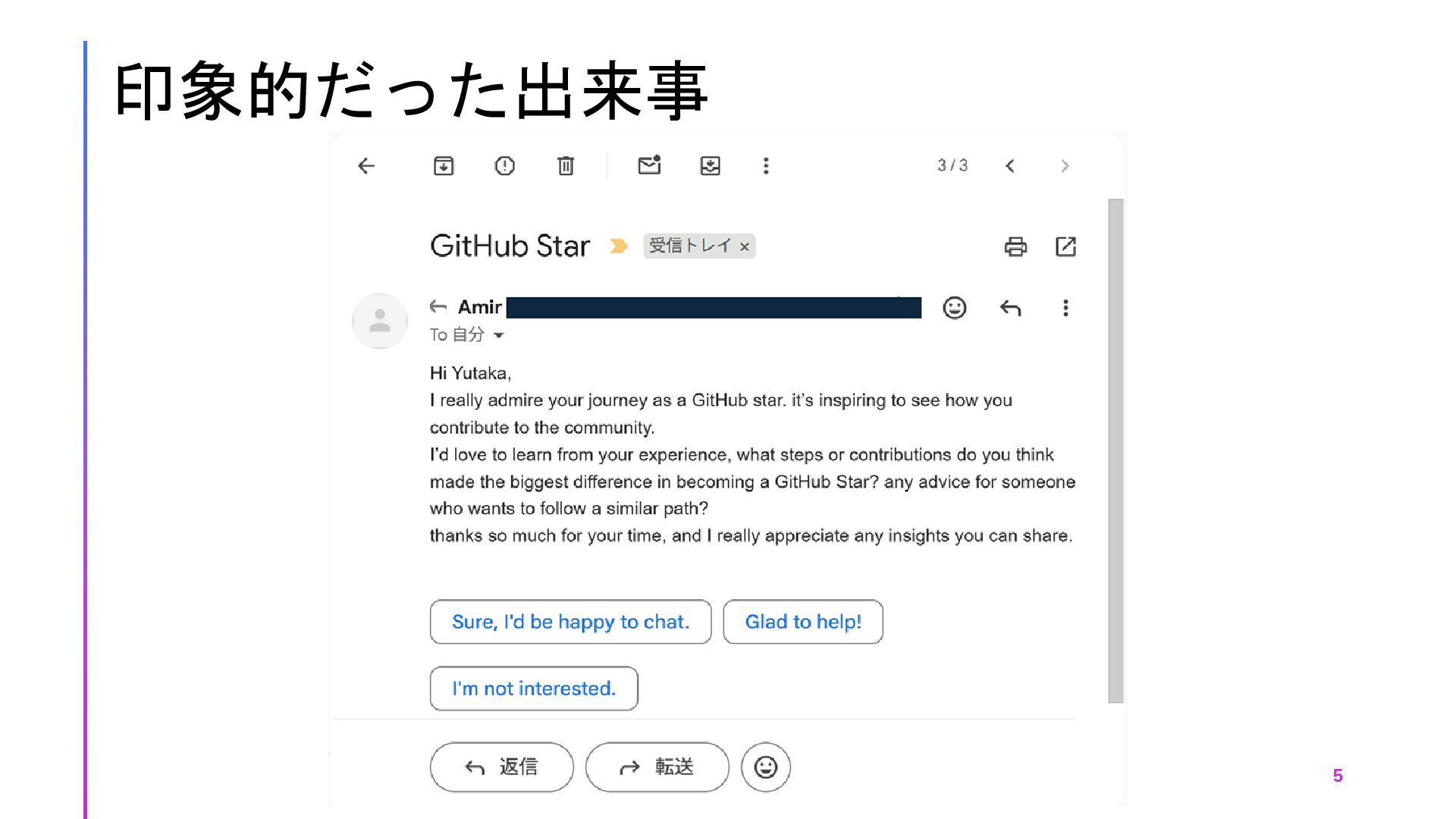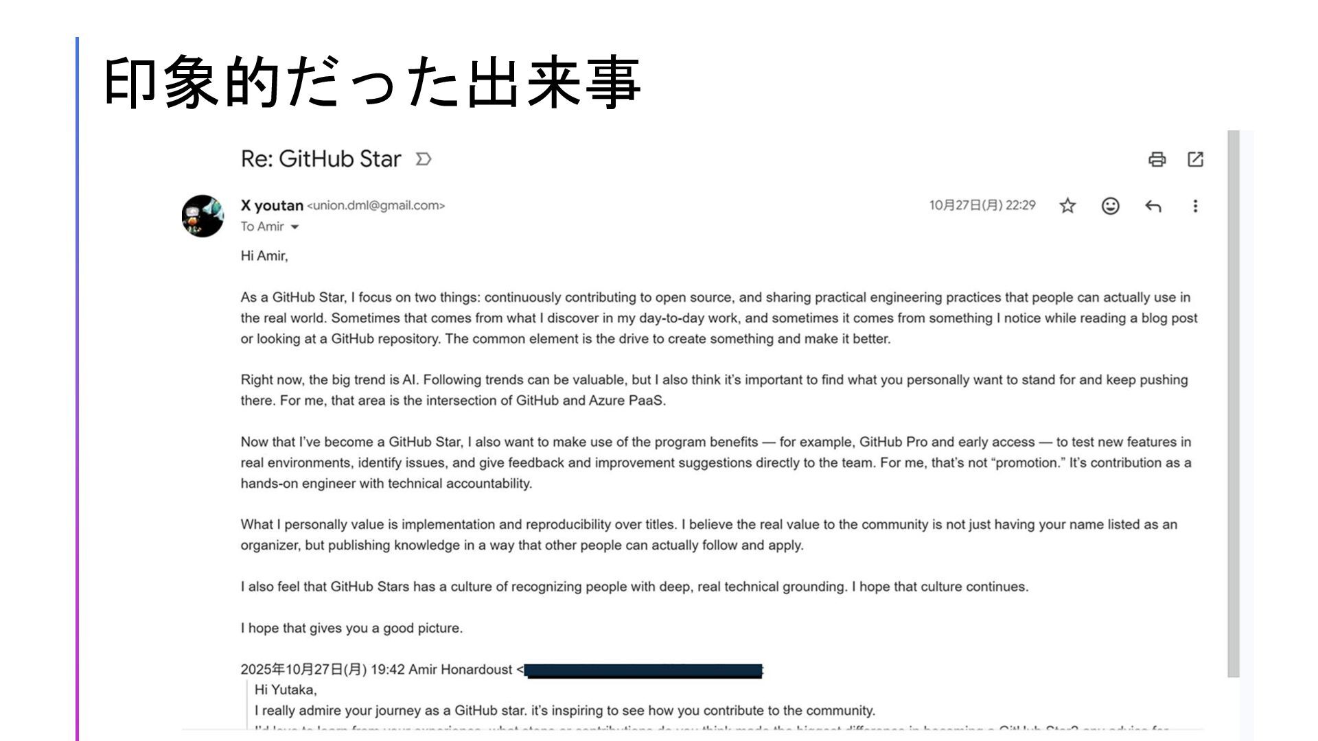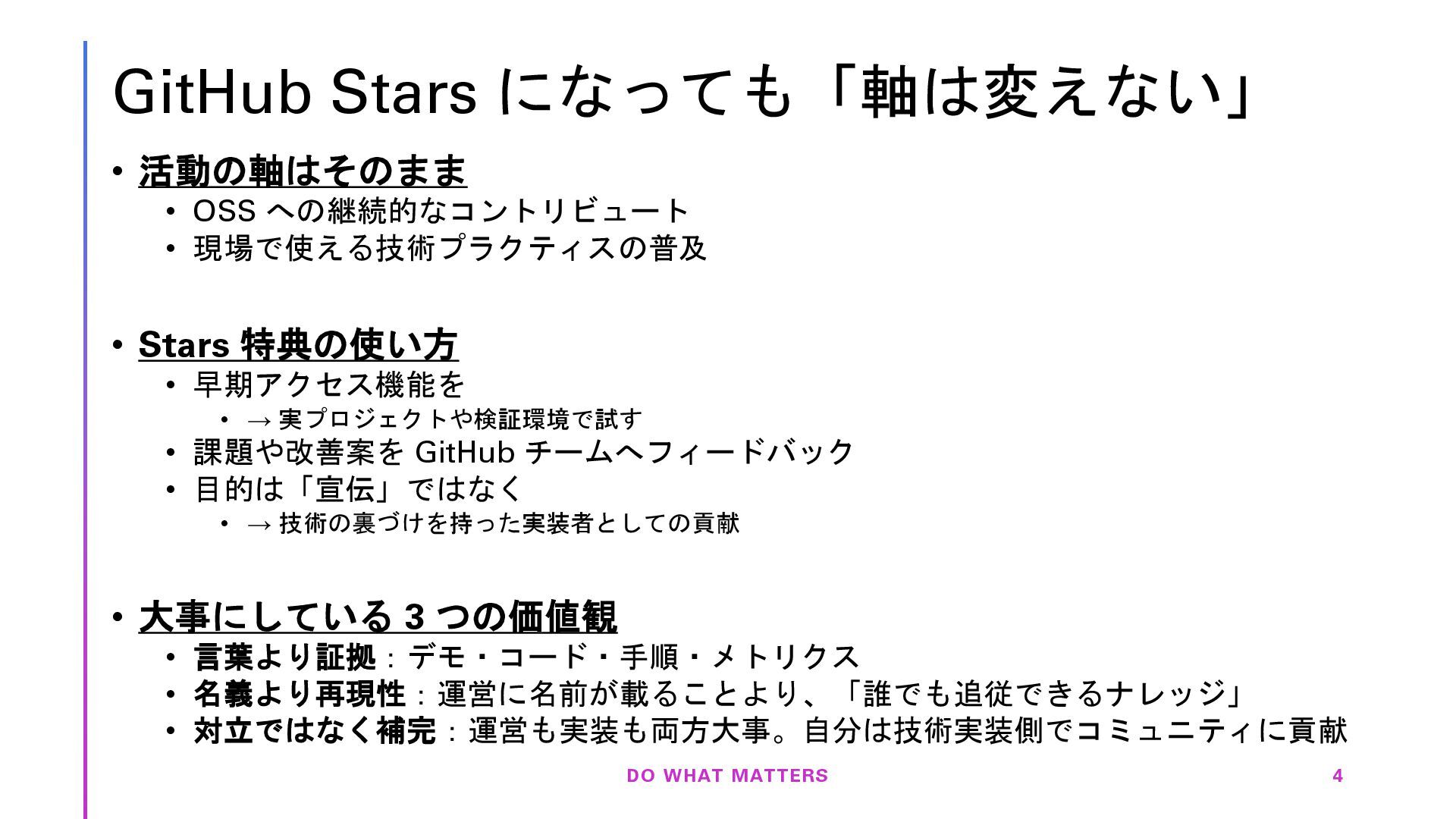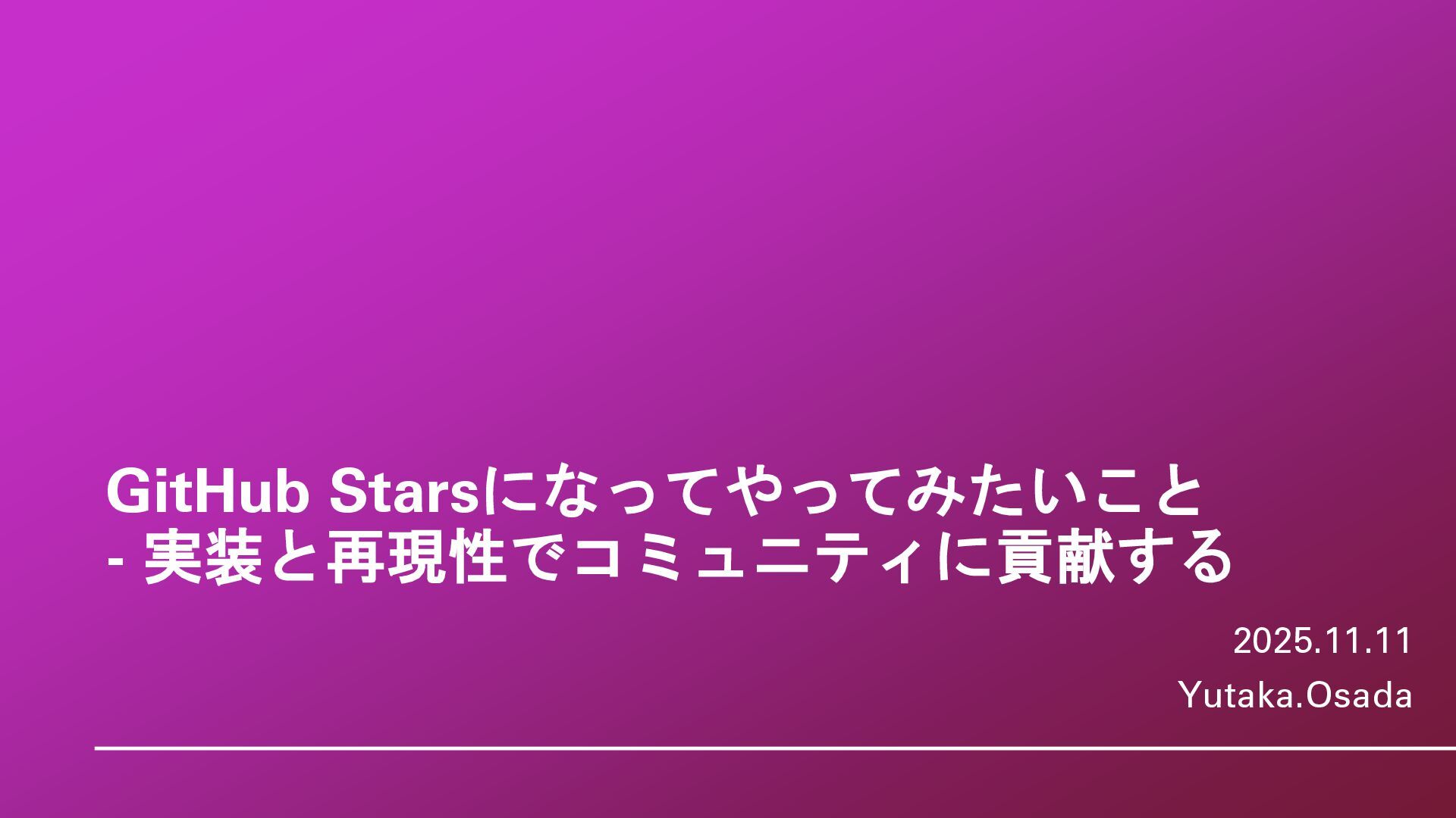 GitHub Stars に選出されたあとも「肩書きより実装と再現性」を軸に活動していく、というテーマの 5 分 LT です。