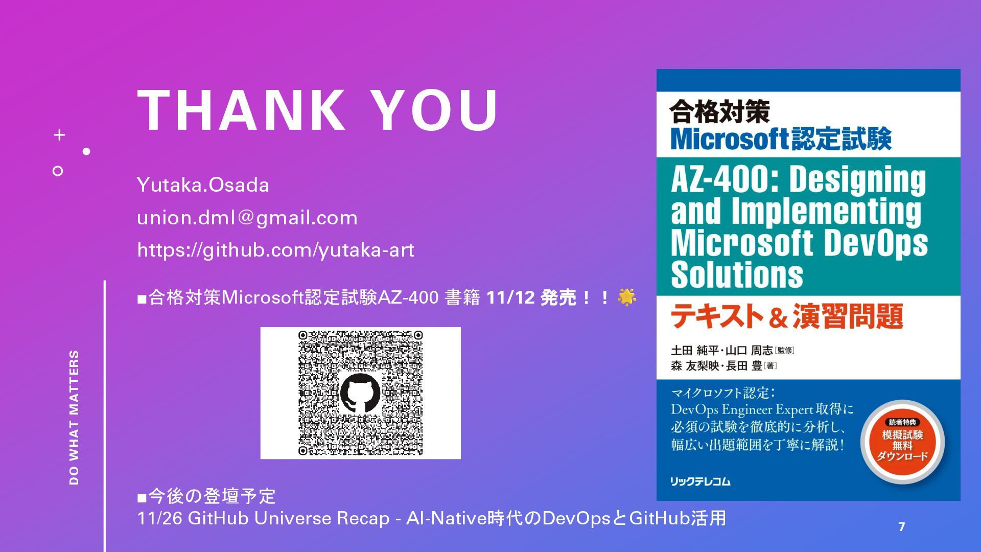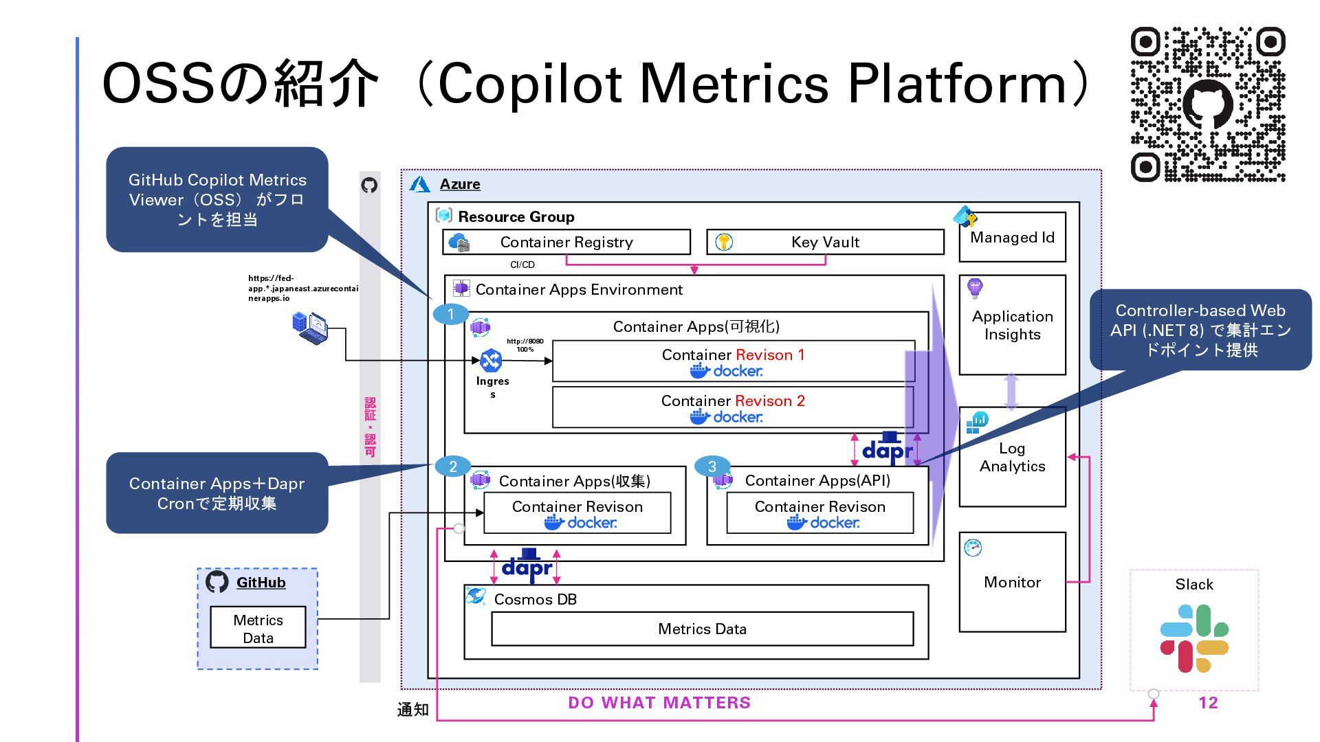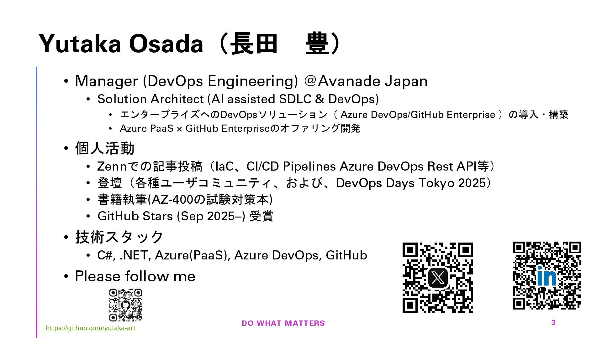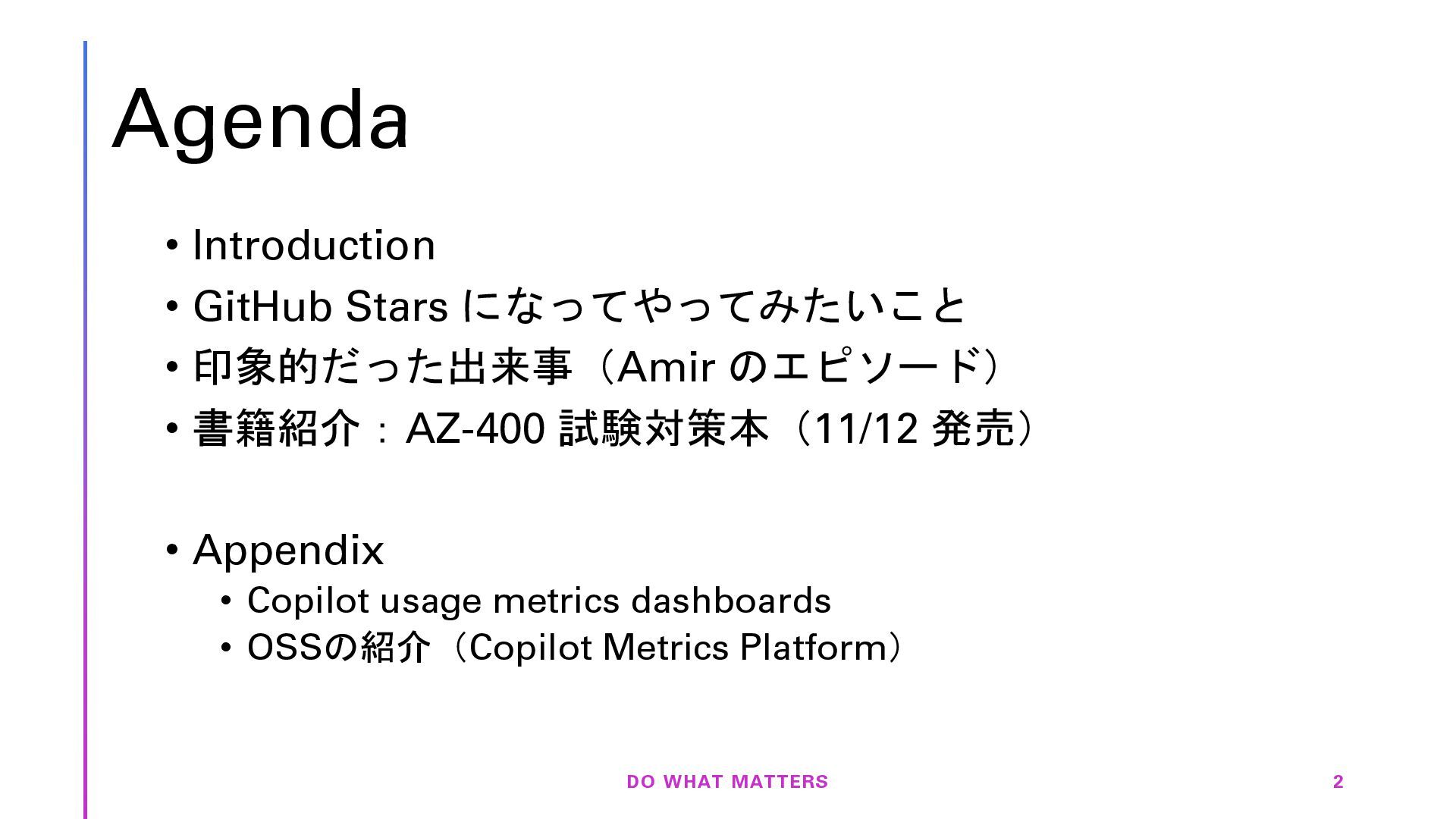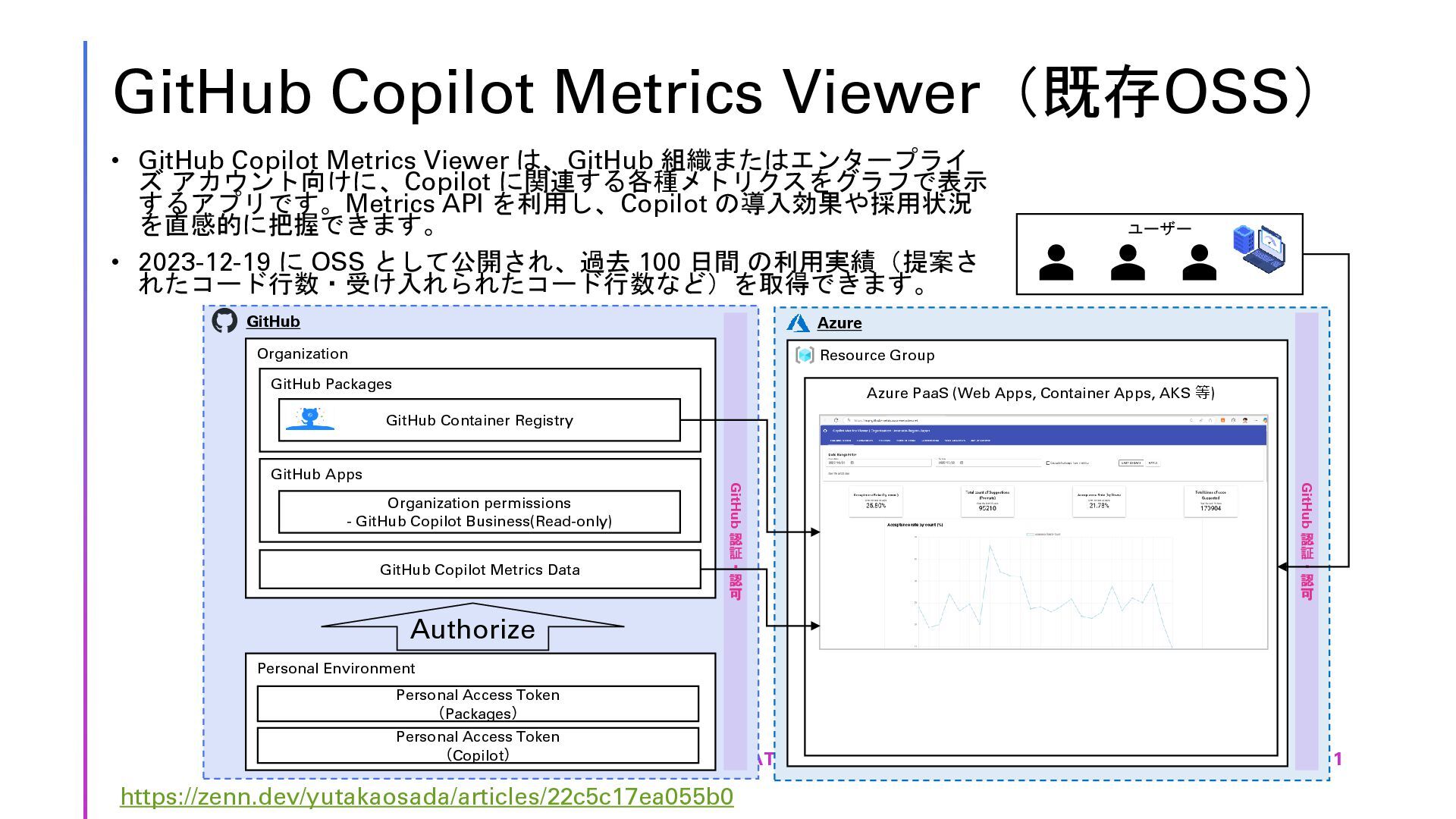 海外エンジニアとのエピソード、Copilot 可視化 OSS「Copilot Metrics Platform / Viewer」、AZ-400 試験対策本などの具体的アウトプットを通じて、「コード・手順・メトリクスでコミュニティに貢献する」スタイルを紹介します。