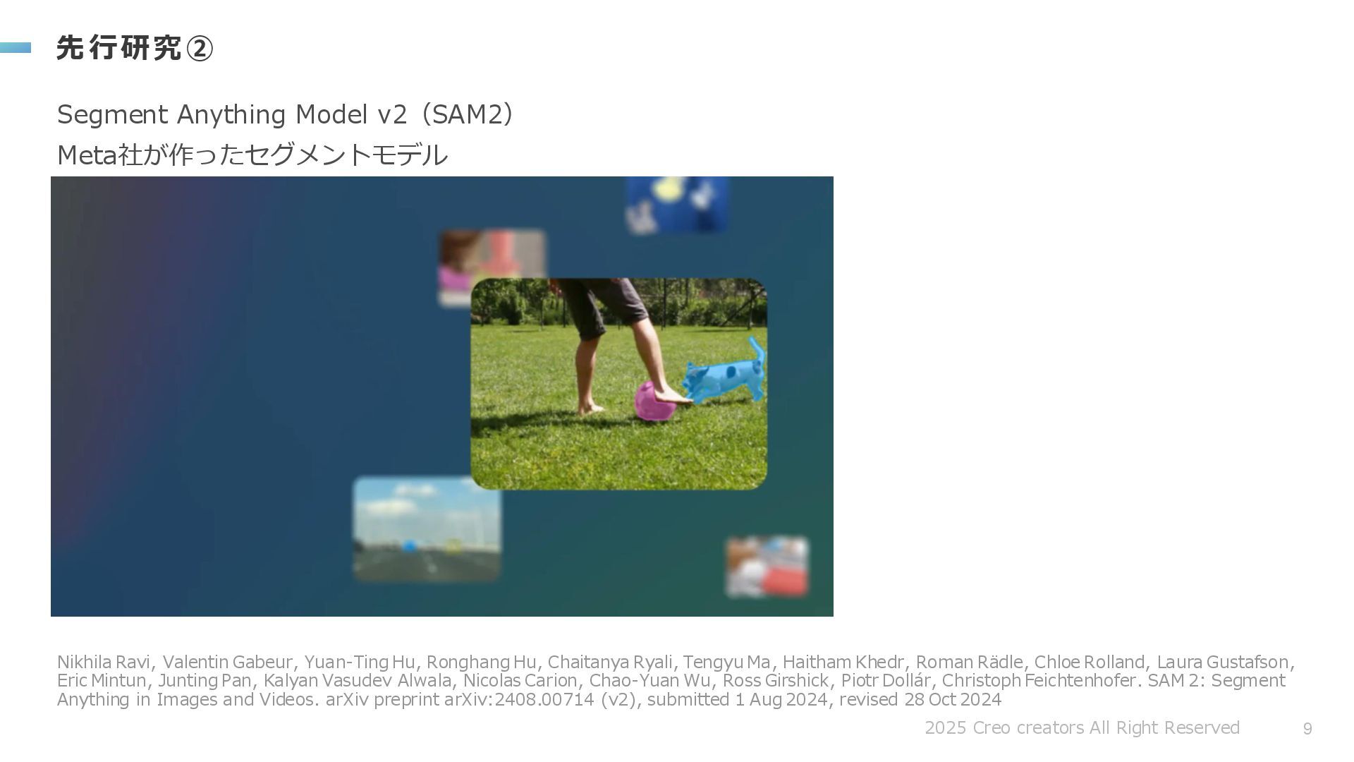 Model v2(SAM2) Meta社が作ったセグメントモデル Nikhila Ravi, Valentin Gabeur, Yuan-Ting Hu, Ronghang Hu, Chaitanya Ryali, Tengyu Ma, Haitham Khedr, Roman Rädle, Chloe Rolland, Laura Gustafson, Eric Mintun, Junting Pan, Kalyan Vasudev Alwala, Nicolas Carion, Chao-Yuan Wu, Ross Girshick, Piotr Dollár, Christoph Feichtenhofer. SAM 2: Segment Anything in Images and Videos. arXiv preprint arXiv:2408.00714 (v2), submitted 1 Aug 2024, revised 28 Oct 2024