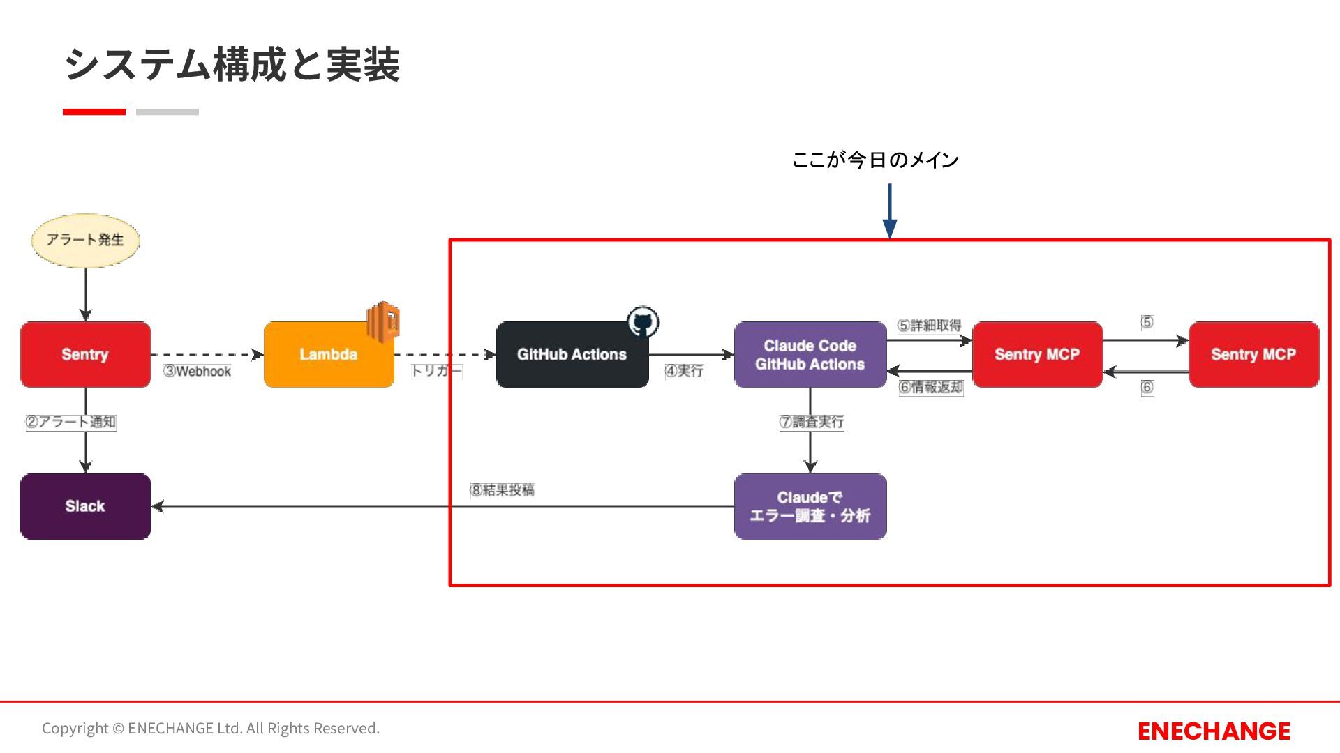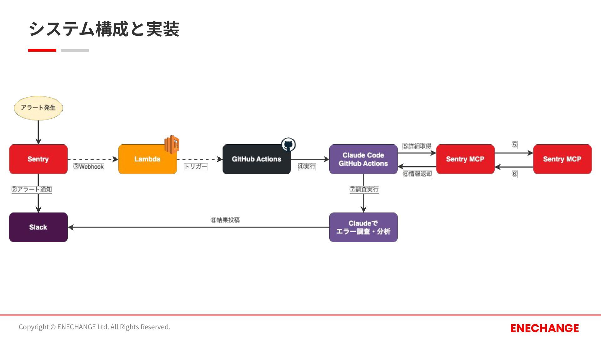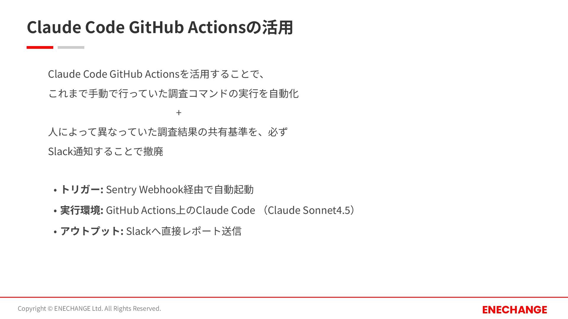 Reserved. ENECHANGE Claude Code GitHub Actionsを活⽤することで、 これまで⼿動で⾏っていた調査コマンドの実⾏を⾃動化 + ⼈によって異なっていた調査結果の共有基準を、必ず Slack通知することで撤廃 • トリガー: Sentry Webhook経由で⾃動起動 • 実⾏環境: GitHub Actions上のClaude Code (Claude Sonnet4.5) • アウトプット: Slackへ直接レポート送信