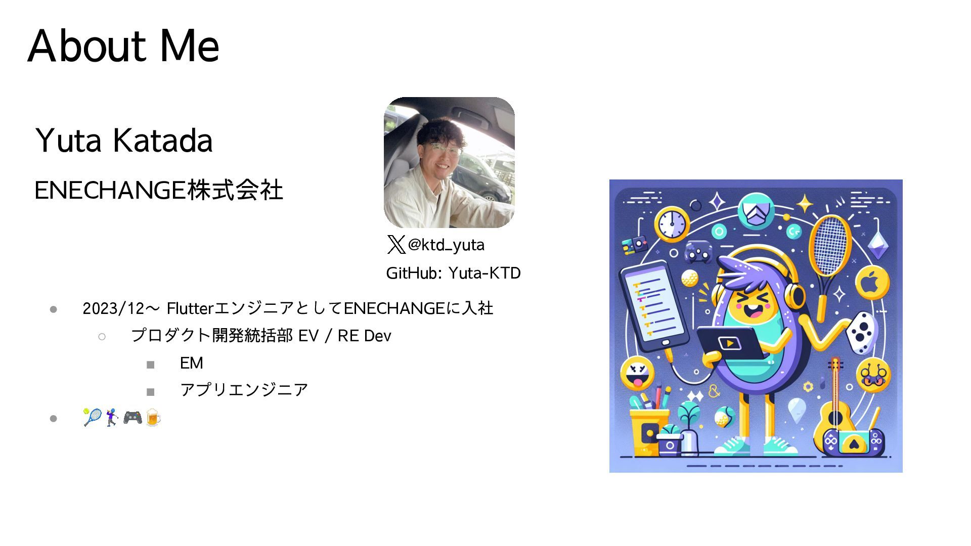 About Me Yuta Katada ENECHANGE株式会社 • 2023/12〜 FlutterエンジニアとしてENECHANGEに入社 ◦ プロダクト開発統括部