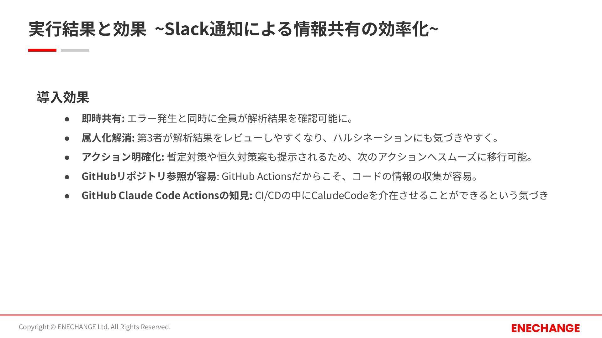 GitHubリポジトリ参照が容易: GitHub Actionsだからこそ、コードの情報の収集が容易。 • GitHub Claude Code Actionsの知⾒: CI/CDの中にCaludeCodeを介在させることができるという気づき 実⾏結果と効果 ~Slack通知による情報共有の効率化~ Copyright © ENECHANGE Ltd. All Rights Reserved. ENECHANGE 導⼊効果