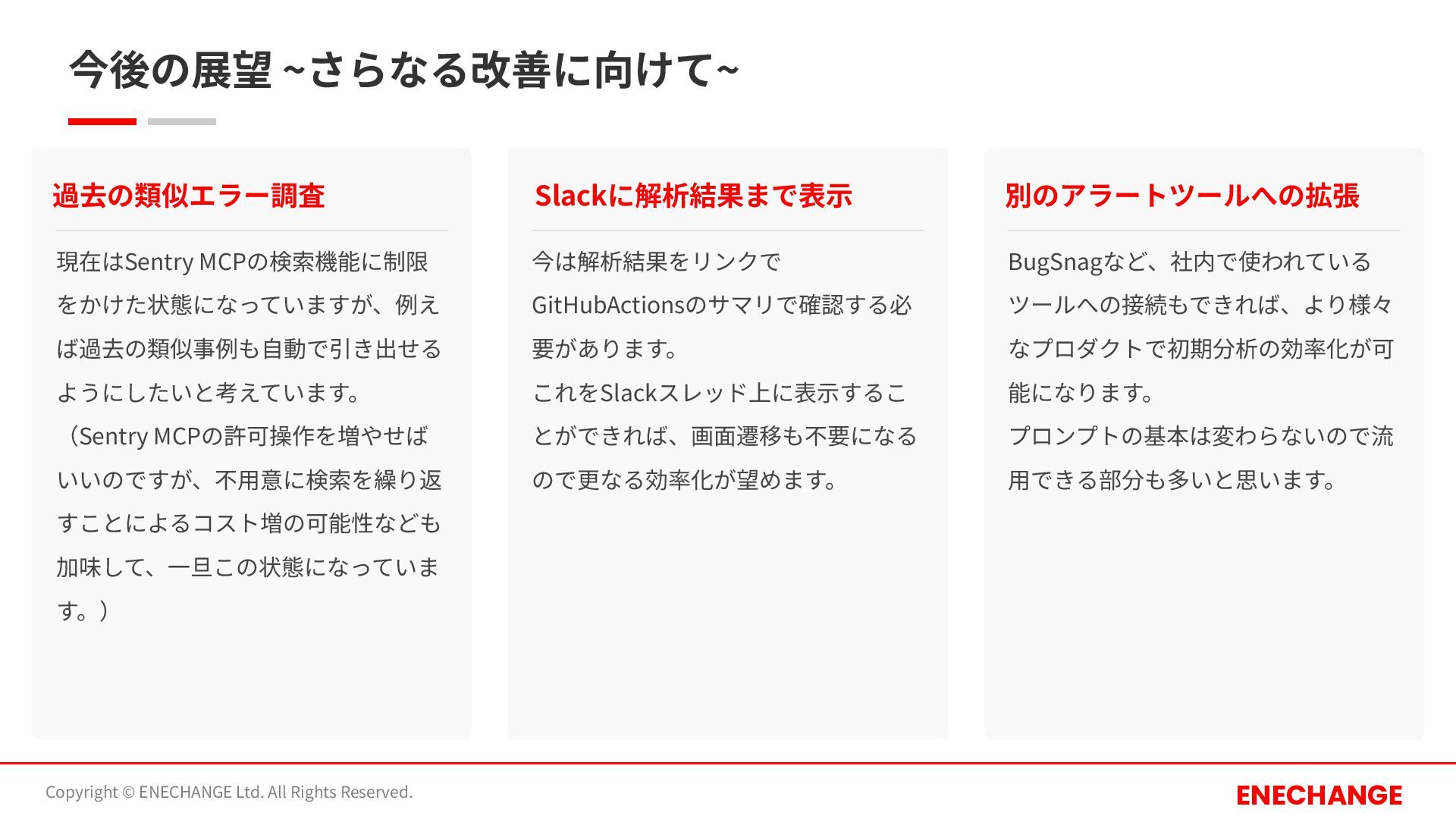 過去の類似エラー調査 現在はSentry MCPの検索機能に制限 をかけた状態になっていますが、例え ば過去の類似事例も⾃動で引き出せる ようにしたいと考えています。 (Sentry MCPの許可操作を増やせば いいのですが、不⽤意に検索を繰り返 すことによるコスト増の可能性なども 加味して、⼀旦この状態になっていま す。) Slackに解析結果まで表⽰ 今は解析結果をリンクで GitHubActionsのサマリで確認する必 要があります。 これをSlackスレッド上に表⽰するこ とができれば、画⾯遷移も不要になる ので更なる効率化が望めます。 別のアラートツールへの拡張 BugSnagなど、社内で使われている ツールへの接続もできれば、より様々 なプロダクトで初期分析の効率化が可 能になります。 プロンプトの基本は変わらないので流 ⽤できる部分も多いと思います。
