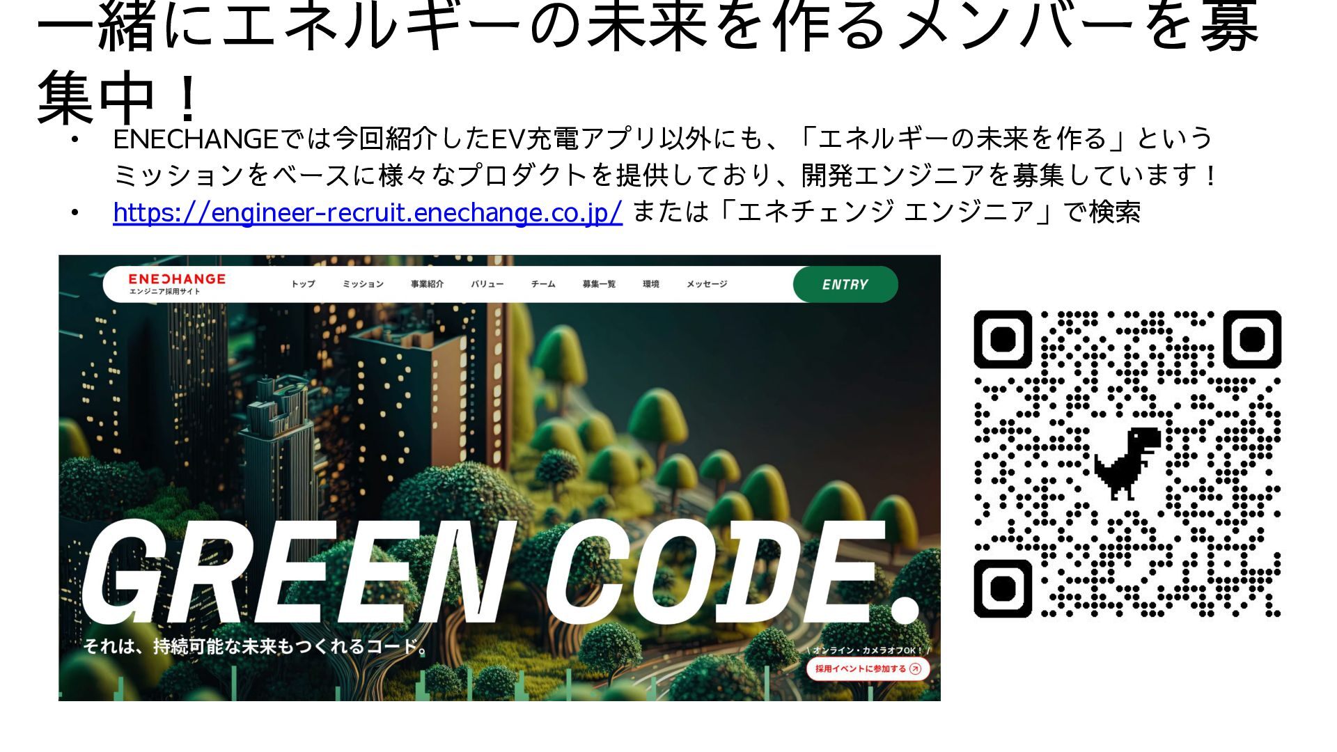 • ENECHANGEでは今回紹介したEV充電アプリ以外にも、「エネルギーの未来を作る」という ミッションをベースに様々なプロダクトを提供しており、開発エンジニアを募集しています! • https://engineer-recruit.enechange.co.jp/ または「エネチェンジ エンジニア」で検索 一緒にエネルギーの未来を作るメンバーを募 集中!