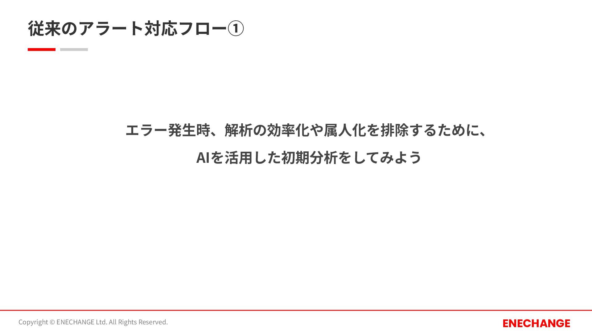 従来のアラート対応フロー② Copyright © ENECHANGE Ltd. All Rights Reserved. ENECHANGE エラー発⽣時、解析の効率化や属⼈化を排除するために、AI