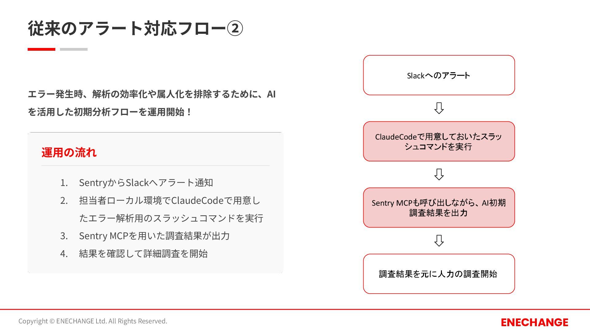 従来のアラート対応フロー① Copyright © ENECHANGE Ltd. All Rights Reserved. ENECHANGE エラー発⽣時、解析の効率化や属⼈化を排除するために、