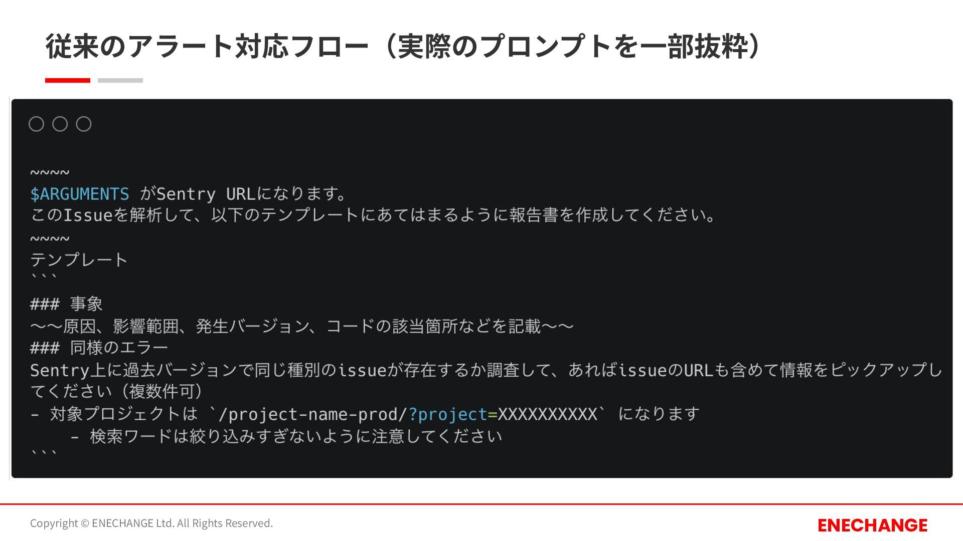従来のアラート対応フロー(実際のプロンプトを⼀部抜粋) Copyright © ENECHANGE Ltd. All Rights Reserved. ENECHANGE