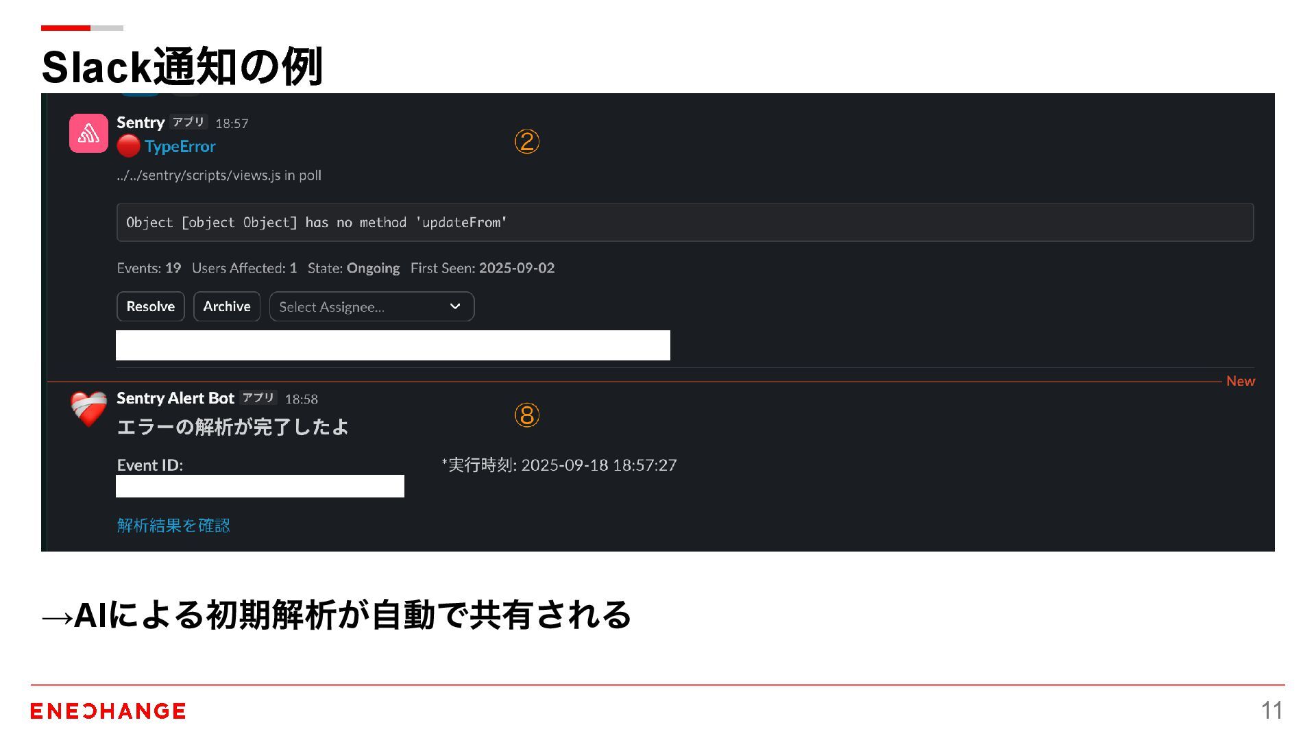 →AI による初期解析が自動で共有される Slack 通知の例 11