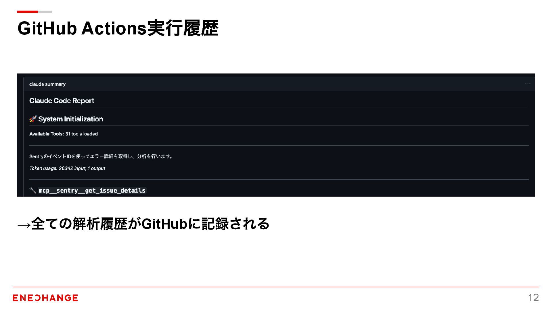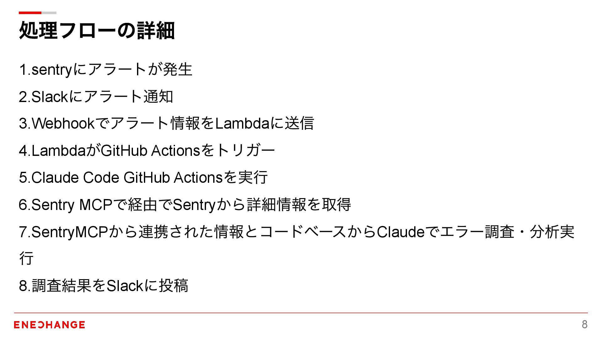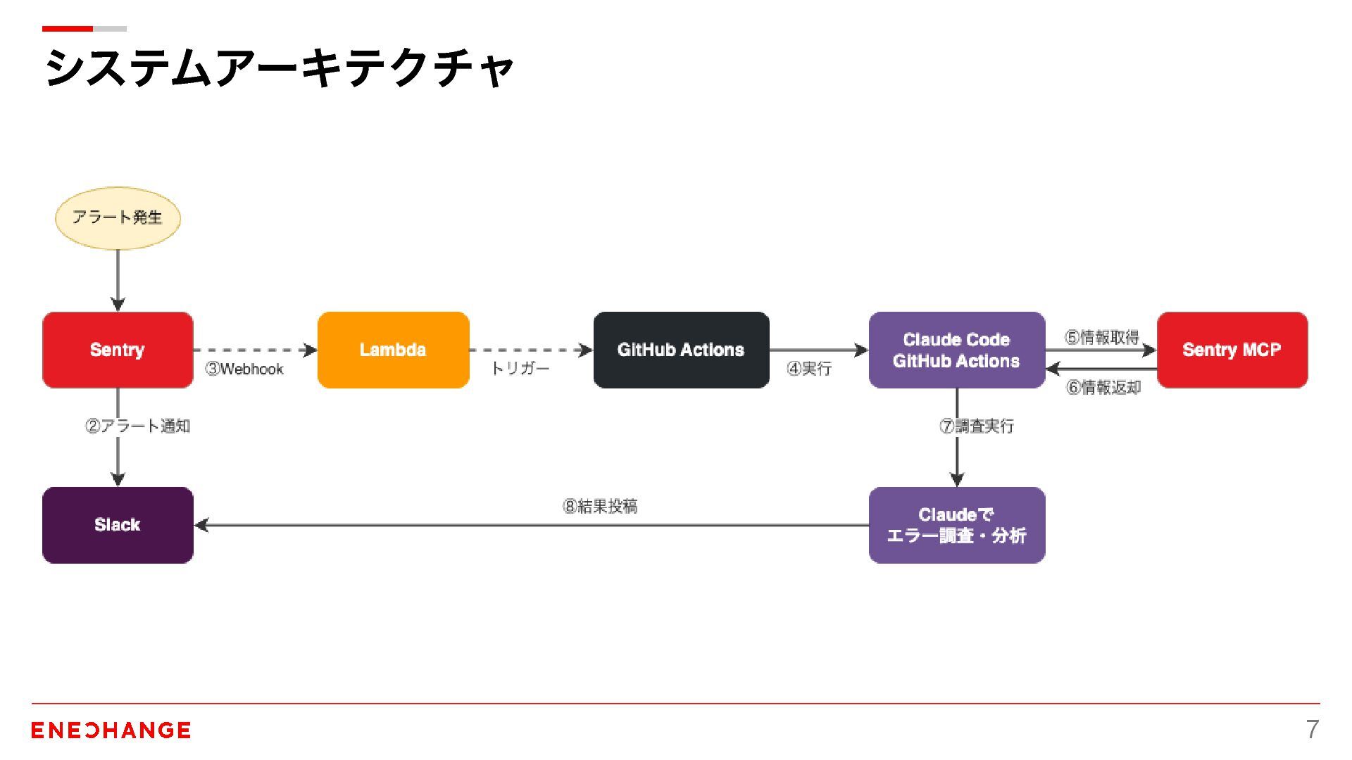 をトリガー 5.Claude Code GitHub Actions を実行 6.Sentry MCP で経由でSentry から詳細情報を取得 7.SentryMCP から連携された情報とコードベースからClaude でエラー調査・分析実 行 8. 調査結果をSlack に投稿 処理フローの詳細 8