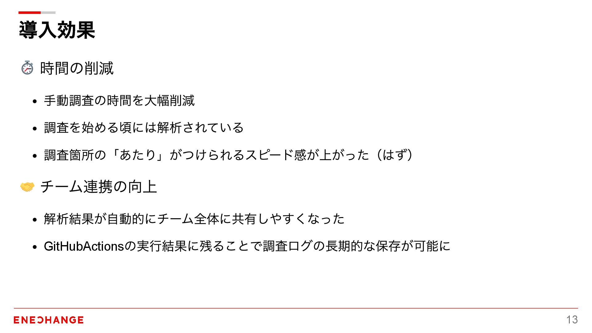 時間の削減 手動調査の時間を大幅削減 調査を始める頃には解析されている 調査箇所の「あたり」がつけられるスピード感が上がった(はず) チーム連携の向上 解析結果が自動的にチーム全体に共有しやすくなった GitHubActions の実行結果に残ることで調査ログの長期的な保存が可能に 導入効果 13