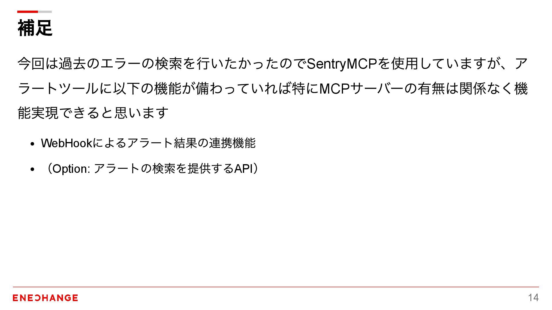 今回は過去のエラーの検索を行いたかったのでSentryMCP を使用していますが、ア ラートツールに以下の機能が備わっていれば特にMCP サーバーの有無は関係なく機 能実現できると思います WebHook によるアラート結果の連携機能 (Option: アラートの検索を提供するAPI )