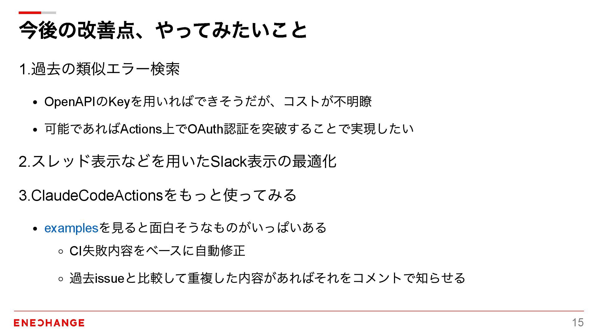 表示の最適化 3.ClaudeCodeActions をもっと使ってみる examples を見ると面白そうなものがいっぱいある CI 失敗内容をベースに自動修正 過去issue と比較して重複した内容があればそれをコメントで知らせる 今後の改善点、やってみたいこと 15
