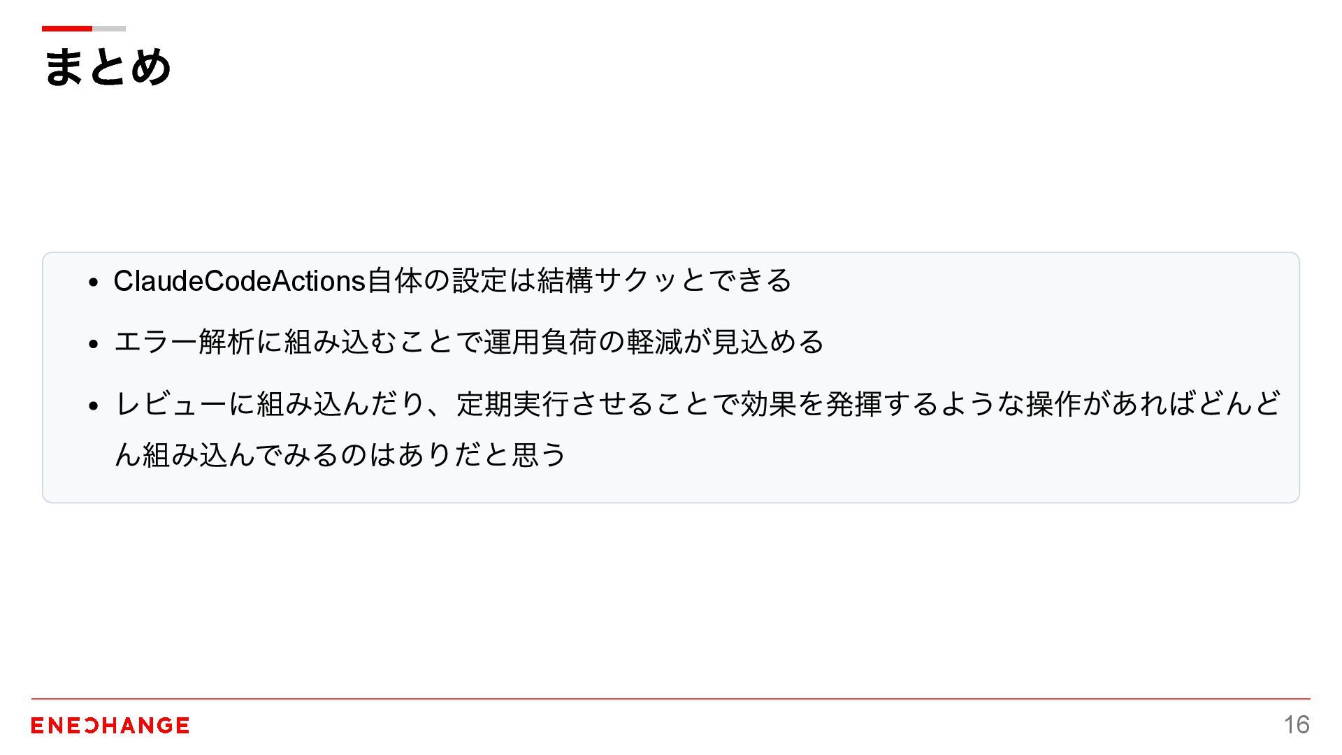 ClaudeCodeActions 自体の設定は結構サクッとできる エラー解析に組み込むことで運用負荷の軽減が見込める レビューに組み込んだり、定期実行させることで効果を発揮するような操作があればどんど ん組み込んでみるのはありだと思う まとめ 16